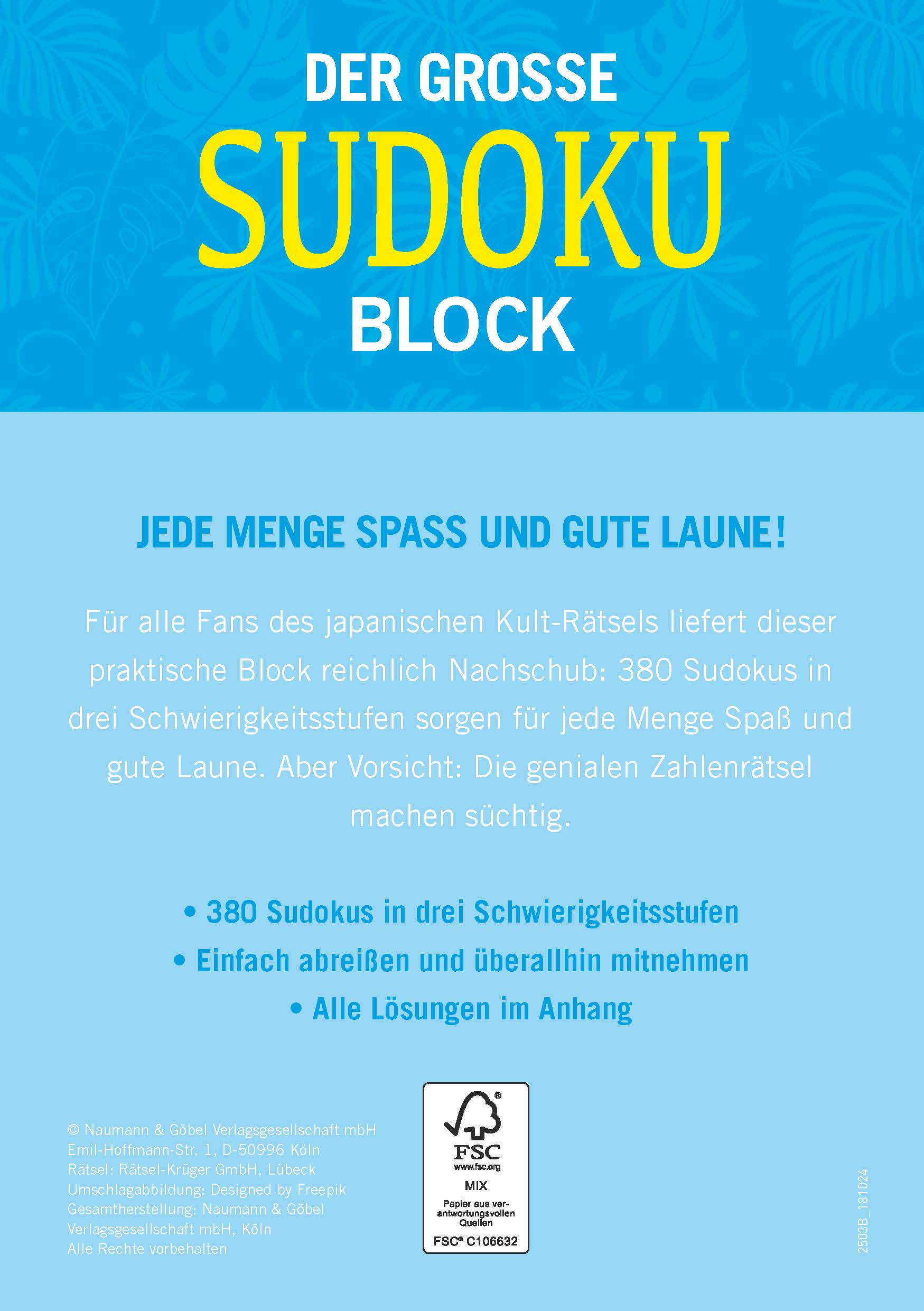 Sudoku ist mittlerweile eine der beliebtesten Rätselformen. Kein Wunder: Genial einfach und doch verflixt schwierig - Sudoku ist ein Knobelspaß der Sonderklasse. Hier kommt reichlich Nachschub für alle Sudoku-Fans: 380 knifflige Herausforderungen lauern in Band 1 unserer neuen Reihe auf Sie. Mit den drei Schwierigkeitsstufen in aufsteigender Reihenfolge können Sie Ihre Sudoku-Skills testen und nach und nach verbessern. Dabei lässt sich die tägliche Rätsel-Portion aus dem praktischen Block ganz einfach herausreißen und überallhin mitnehmen. So können Sie Ihrer Rätsel-Leidenschaft immer und überall nachgehen. Und mit Kombinationsgabe, Konzentrationsfähigkeit und Ausdauer werden Sie im Handumdrehen zum wahren Sudoku-Meister. Aber Vorsicht: Die genialen Zahlenrätsel machen süchtig.