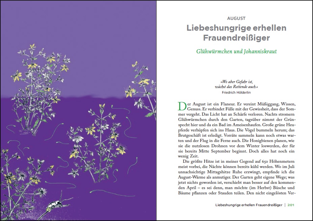 Die Kraft des Gartens springt ganz ohne Hochglanzfotos nur durch die Poesie der Worte, begleitet von 12 farbigen Illustrationen von Ulrike Peters, auf den Leser über.«