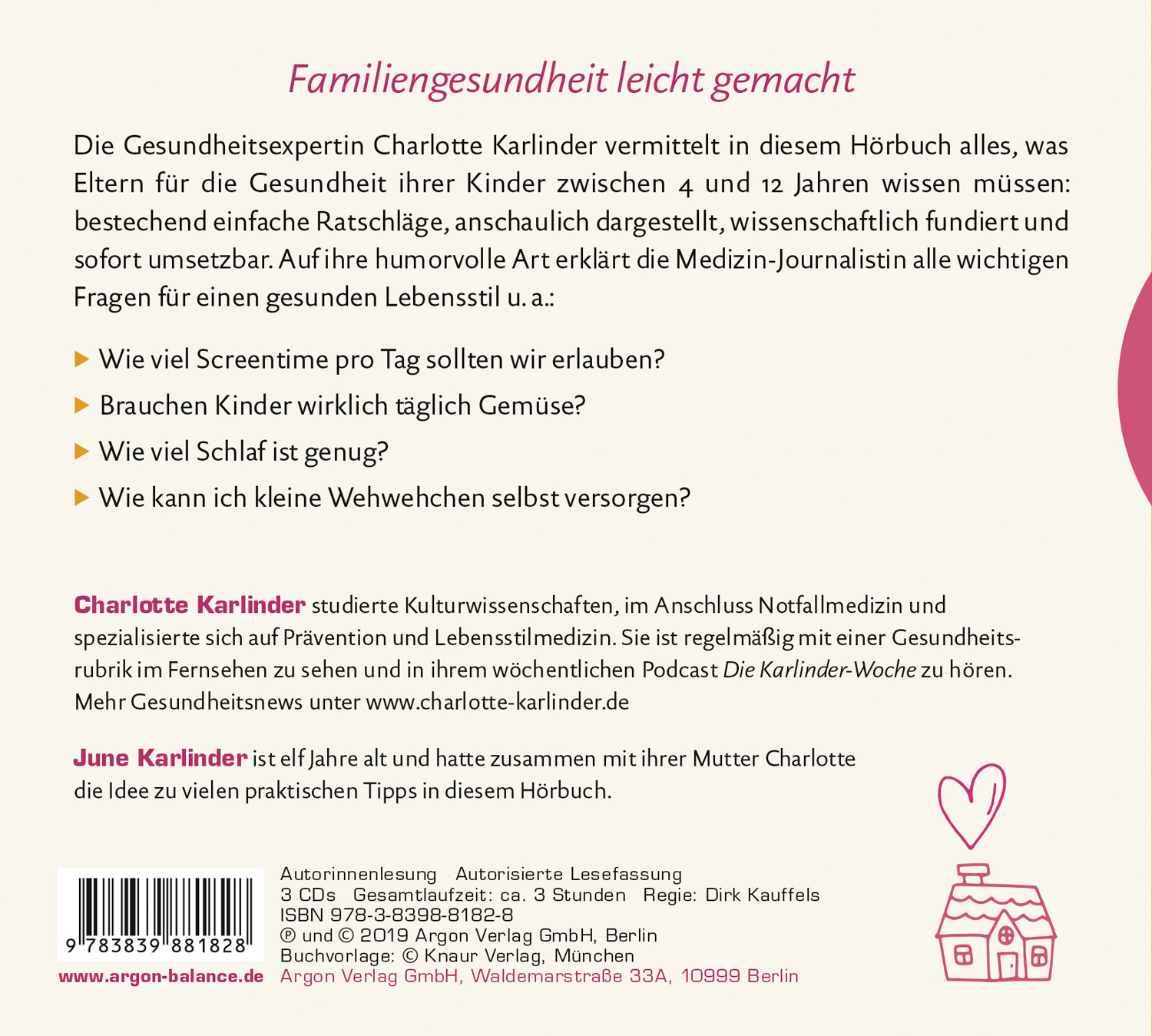 lt;p>Gesundheit macht Spaß! Auf ihre sympathische Art gibt Charlotte Karlinder Tipps, wie Eltern auch ihren Sprösslingen das Thema Gesundheit nahebringen können, ohne dabei zum Moralapostel zu werden. Dabei hat sie alle Lebensbereiche von Kindern zwischen 4 und 12 Jahren im Blick: Welche Ernährung ist wichtig? Wie viel Bewegung, aber auch Erholung muss sein? Worauf ist bei Fieber, Erkältungen oder Schmerzen zu achten? Wie sieht der richtige Umgang mit Smartphone und Tablet aus? Wie gestalten wir das Leben in der Patchworkfamilie? Und was sollte die Notfallapotheke enthalten? Unser Fazit: das perfekte Hörbuch für die Familiengesundheit!