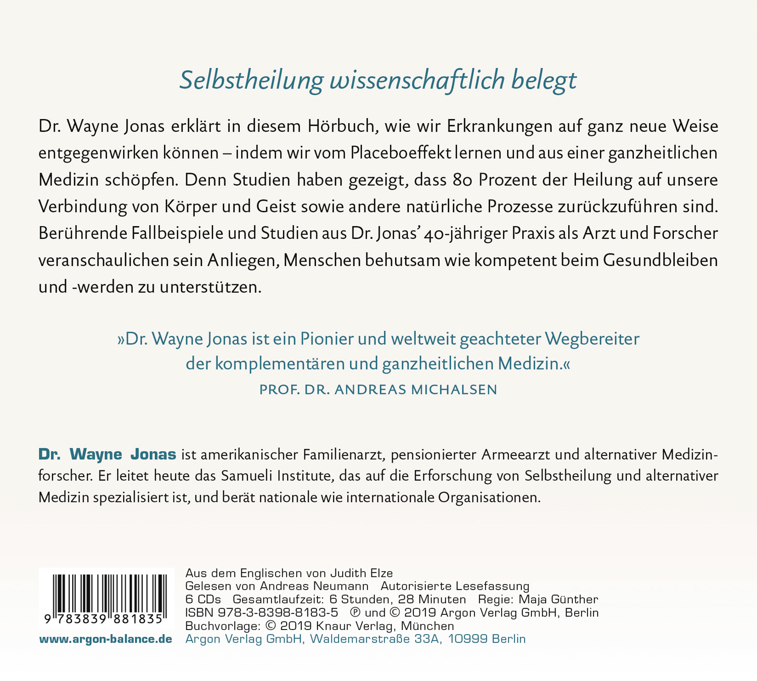 lt;p>Wayne Jonas erklärt, wie wir Erkrankungen entgegenwirken können - indem wir vom Placeboeffekt lernen und aus einer ganzheitlichen Medizin schöpfen. Studien haben gezeigt, dass 80 Prozent der Heilung auf unsere Körper-Geist-Verbindung und andere natürliche Prozesse zurückzuführen sind und nur 20 Prozent auf Therapie und Medikamente. Anhand zahlreicher Patientengeschichten aus seiner 40-jährigen Praxis als Arzt beschreibt Jonas anschaulich und wissenschaftlich untermauert, wie dieser Heilungsprozess funktioniert und was wir tun können, um unsere angeborene Heilfähigkeit zu aktivieren. Das Hörbuch gibt konkrete Anleitungen, durch welche Verhaltensweisen wir unsere Selbstheilungskräfte unterstützen können.