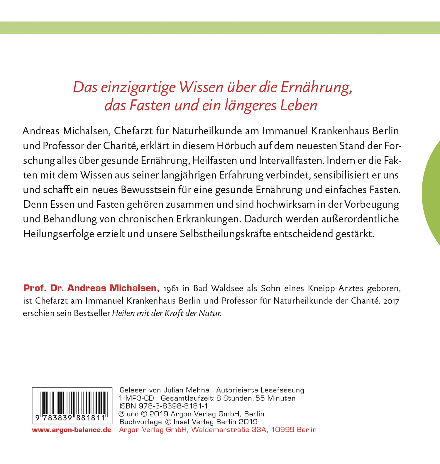 lt;p>Andreas Michalsen widmet sich in seinem neuen Hörbuch wieder seinem größten Anliegen: uns gesünder zu machen. Auf seine sehr persönliche, kompetente und überzeugende Art zeigt er, dass die richtige Ernährung dem Körper nicht nur Impulse zur Regenerierung und Selbstheilung gibt. Sie ist nichts weniger als der Schlüssel zu einem längeren Leben. Welche sind die lebenswichtigen Nahrungsmittel und ihre Nährstoffe, und welche Ernährungsformen (von mediterraner Kost über vegetarisch bis vegan) sind die gesündesten? Welche Art von Fasten (Heilfasten, intermediäres Fasten oder Intervallfasten) passt zu wem? Die neuesten Erkenntnisse aus der Praxis und eigenen Studien der Charité werden ergänzt um weitere aktuelle Forschungsergebnisse. Dieses Hörbuch ist erhellend und wegweisend, zur einfachen Anwendung für jedermann und immer mit dem Credo: Genuss statt Verzicht.