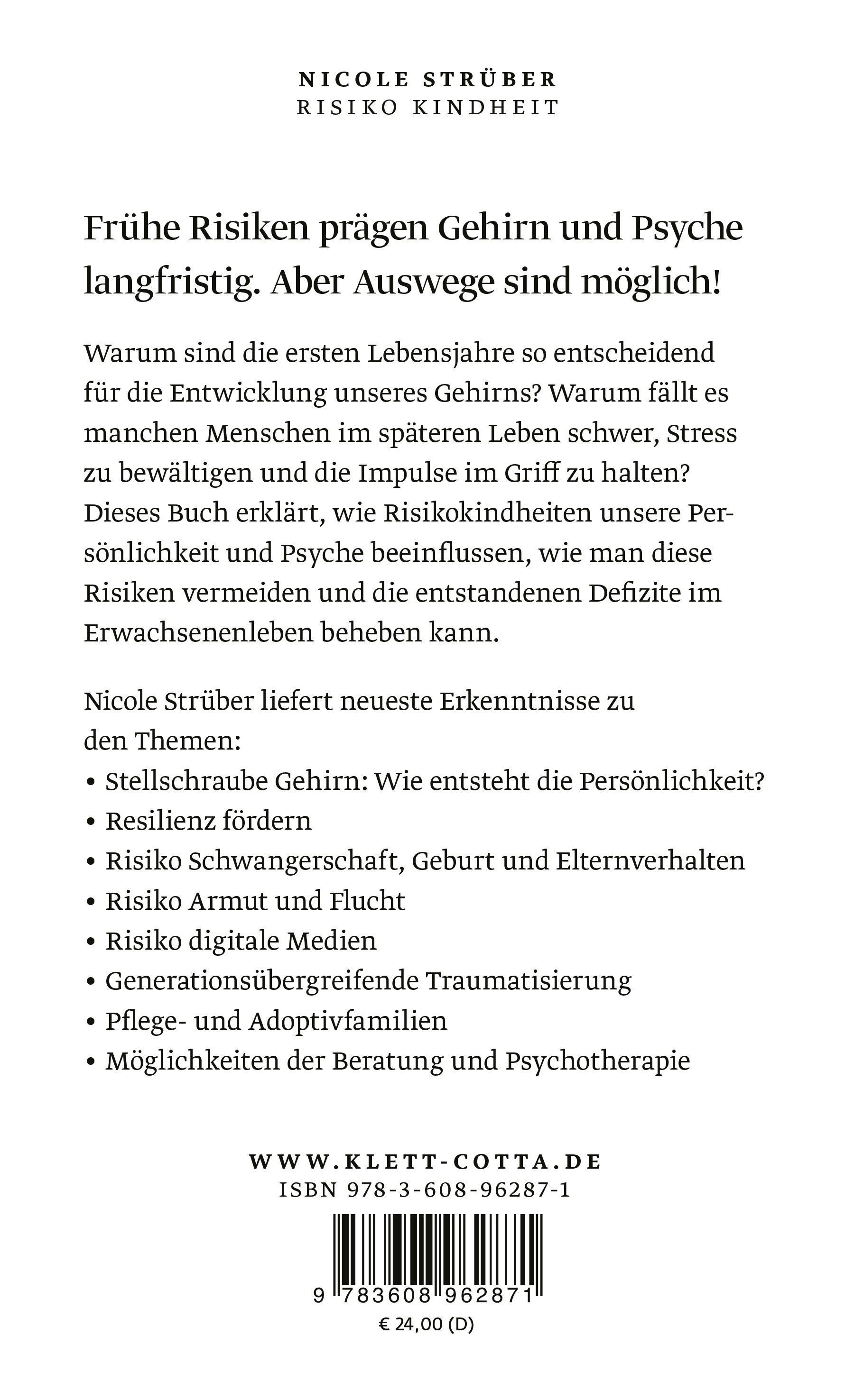 Warum sind die ersten Lebensjahre so entscheidend für die Entwicklung unseres Gehirns? Warum fällt es manchen Menschen im späteren Leben schwer, Stress zu bewältigen und die Impulse im Griff zu halten? Dieses Buch erklärt, wie Risikokindheiten unsere Persönlichkeit und Psyche beeinflussen, wie man diese Risiken vermeiden und die entstandenen Defizite im Erwachsenenleben beheben kann.