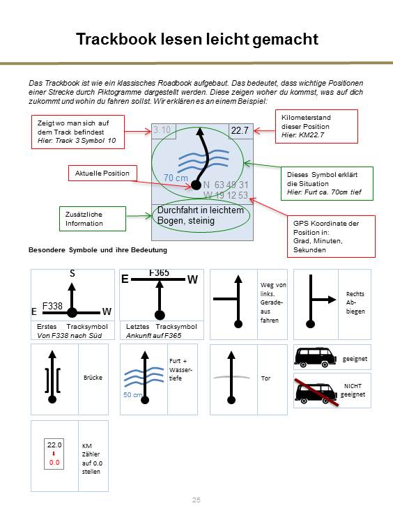 Das Trackbook soll ausdrücklich kein weiterer Islandreiseführer sein. Es enthält keine Information zu Kultur, Geschichte, Restaurants oder Unterkünften. Es ist als zusätzliche Informationsquelle für Reisen durch das Hochland gedacht, als nützliches Werkzeug im Roadbookstil für die Planung und Durchführung einer individuellen Tour für verschiedene Fahrzeugtypen. Es lässt sich am besten mit der Hochlandkarte von Mál og Menning (ISBN 9979-3-2398-3) kombinieren, welche wir dank derer großzügigen Unterstützung nutzen, um die meisten Strecken zu visualisieren.