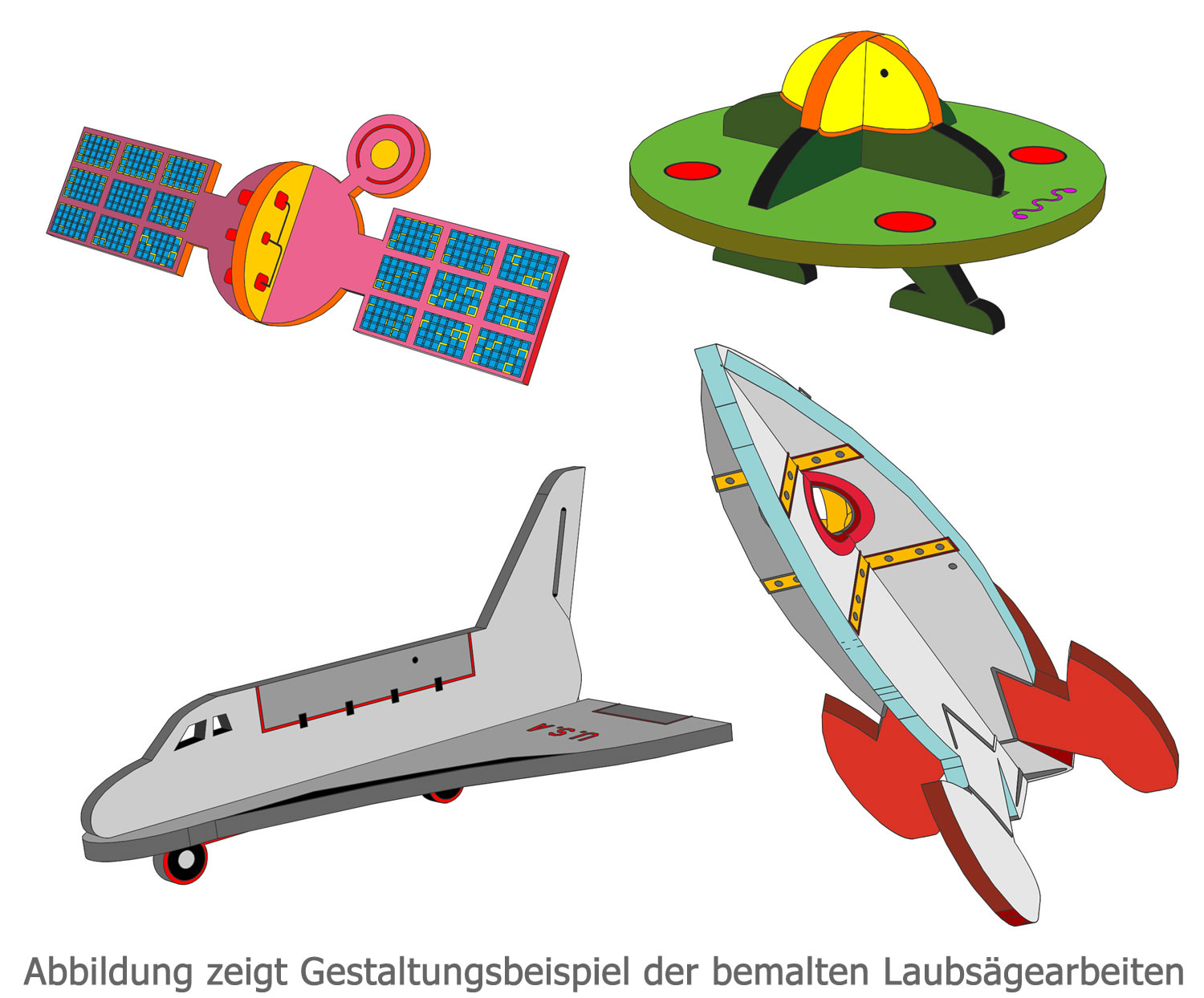 Vier 3D-Modelle eines Space Shuttles, eines UFOs ('Unbekanntes FlugObjekt'), eines Satelliten und einer Rakete aus 3mm Pappelsperrholz. Mit den beigefügten Mobile-Stäben kann in kurzer Zeit ein tolles Mobile hergestellt werden, das seinen Platz im Kinderzimmer oder im Wohnzimmer findet. Laubsägearbeiten bieten nicht nur stundenlangen Bastelspaß, sie fördern auch die Entwicklung des Kindes in den Bereichen Konzentration und motorische Fähigkeiten. Ob für Sie selbst oder für Ihre Kinder: Genießen Sie ein tolles Hobby mit hochwertigen Laubsägevorlagen aus dem Hause DREIPUNKT®!