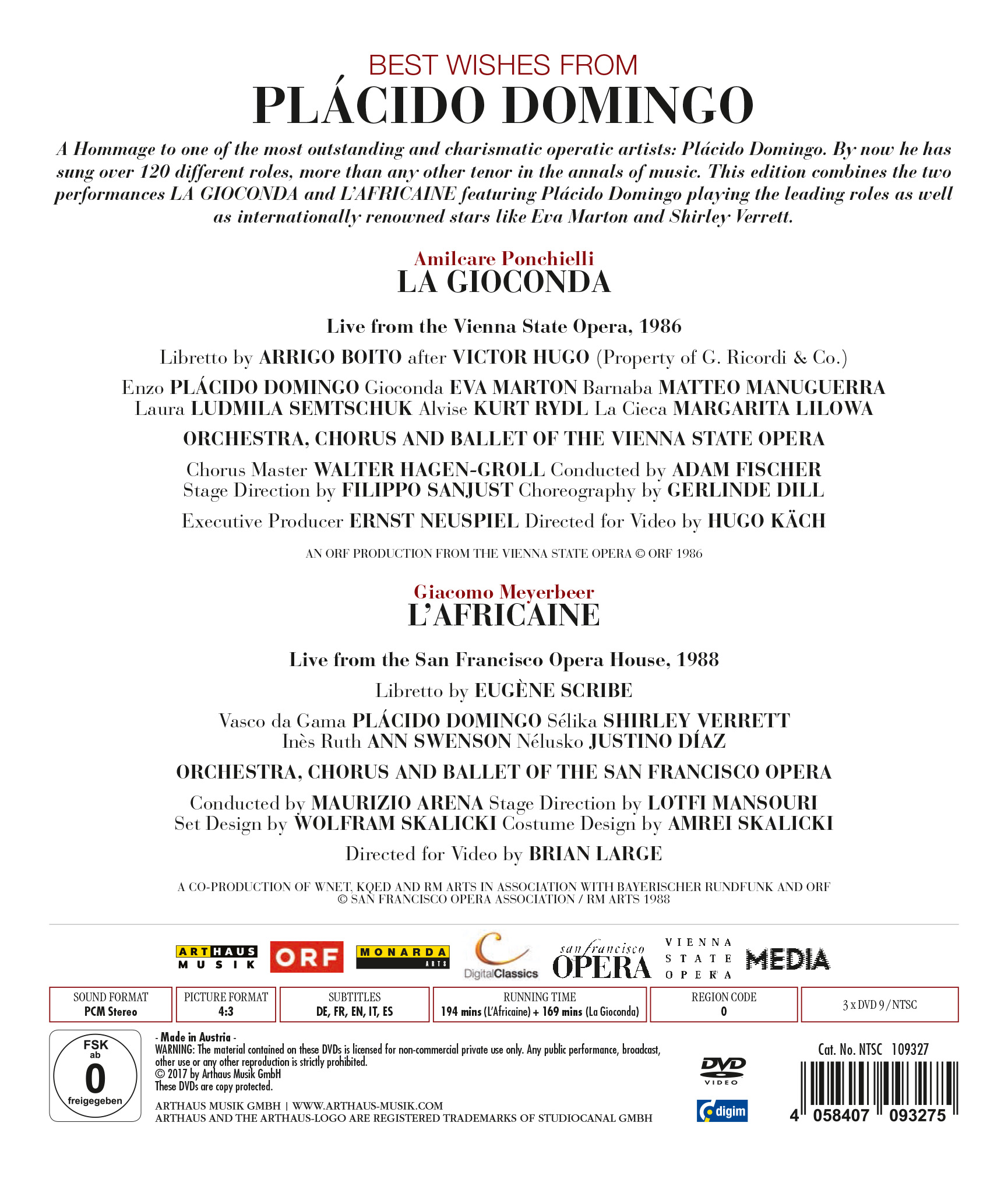 A Hommage to one of the most outstanding and charismatic operatic artists: Plácido Domingo. By now he has sung over 120 different roles, more than any other tenor in the annals of music. His repertoire spans the gamut from Mozart to Verdi, from Berlioz to Puccini, from Wagner to Ginastera. He sings in every important Opera House in the world and has made an unparalleled amount of recordings. This edition combined the two performances LA GIOCONDA and L'AFRICAINE featuring Plácido Domingo playing the leading roles as well as internationally renowned stars like Eva Marton and Shirley Verrett.