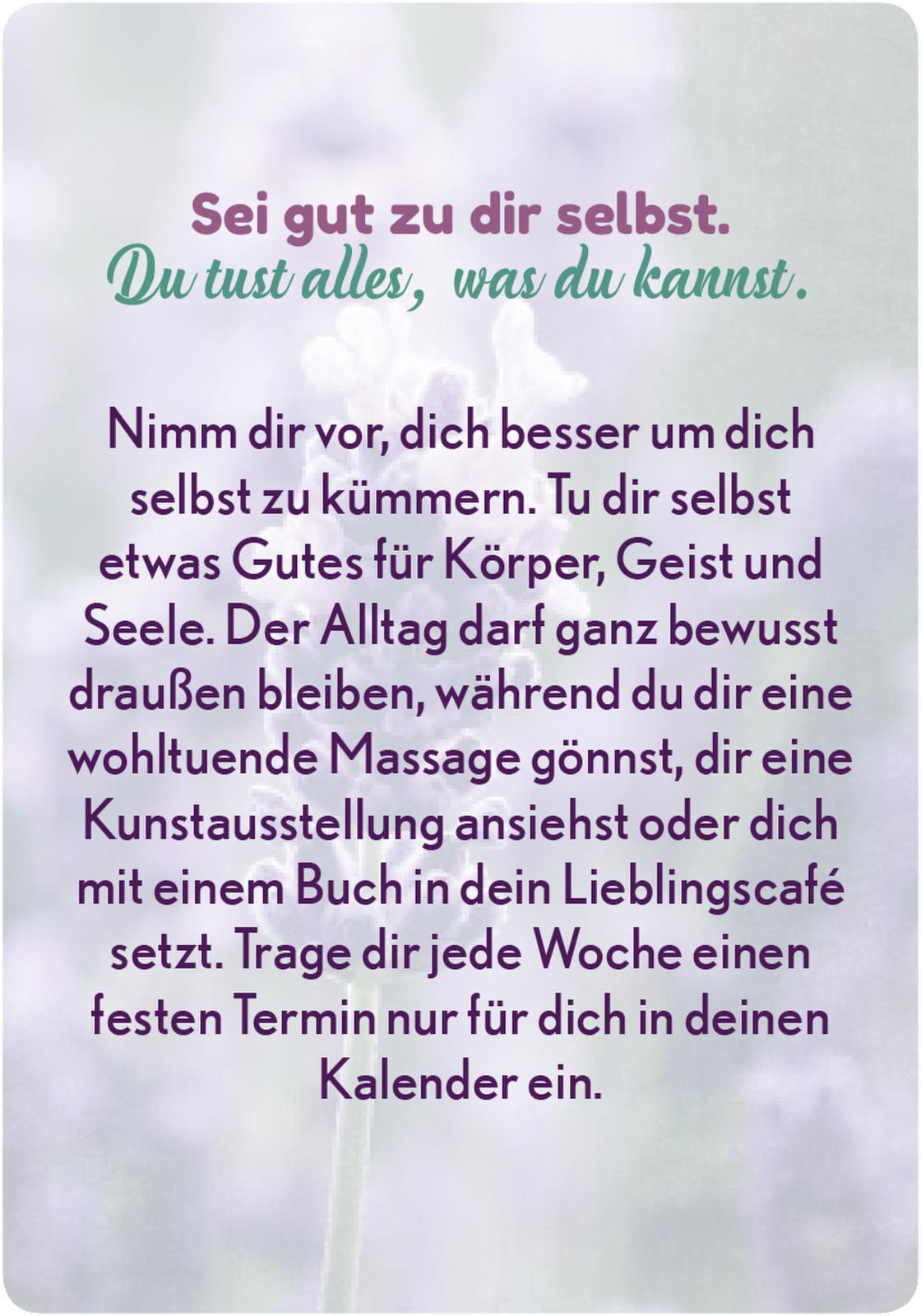 - Finde dein Ritual: Ziehe jeden Morgen ein Kärtchen als Inspiration für den neuen Tag oder bei Bedarf