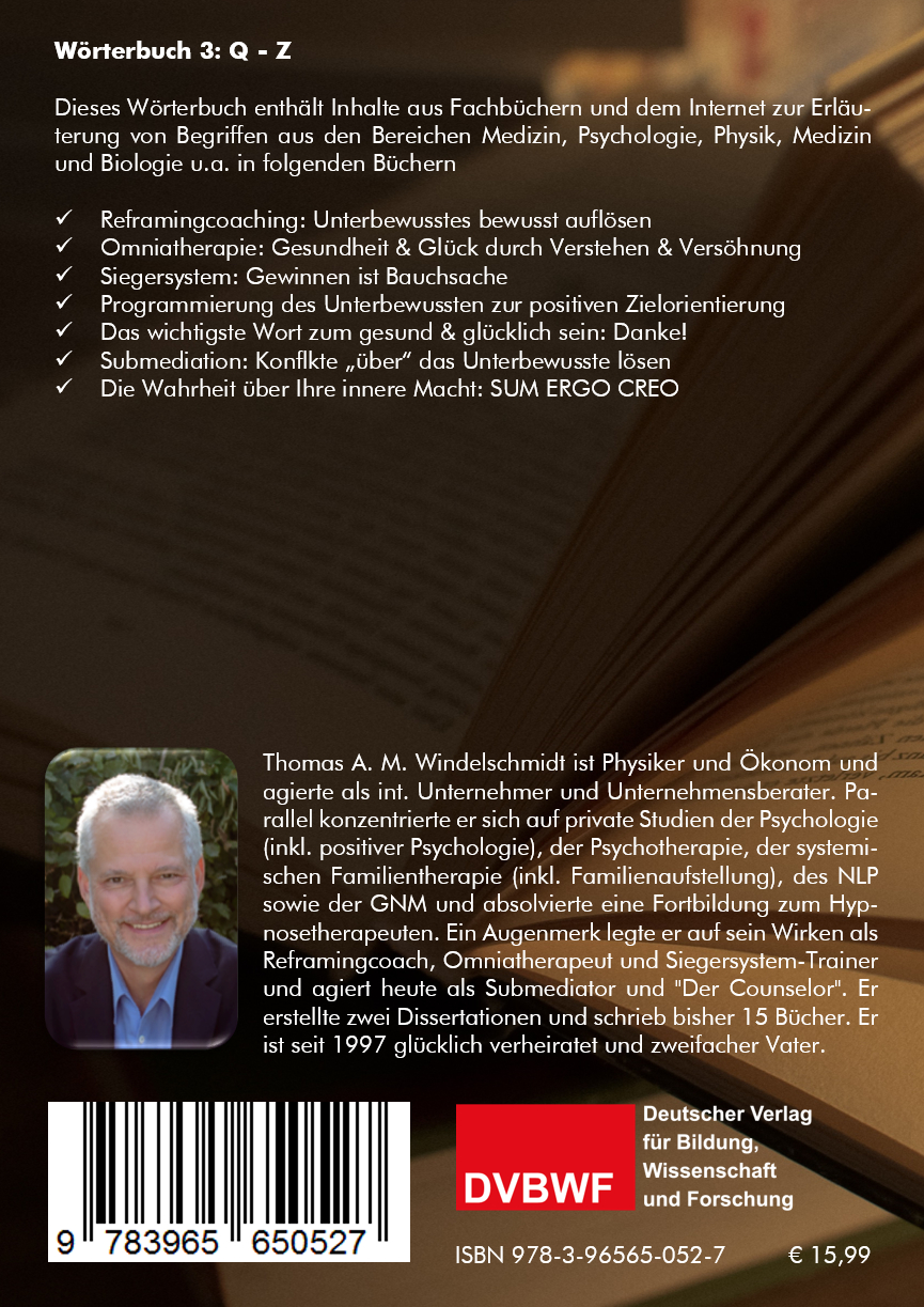 Dieses Wörterbuch enthält Inhalte aus Fachbüchern und dem Internet zur Erläuterung von Begriffen aus den Bereichen Medizin, Psychologie, Physik, Chemie, Biologie und Religion u.a. in folgenden Büchern