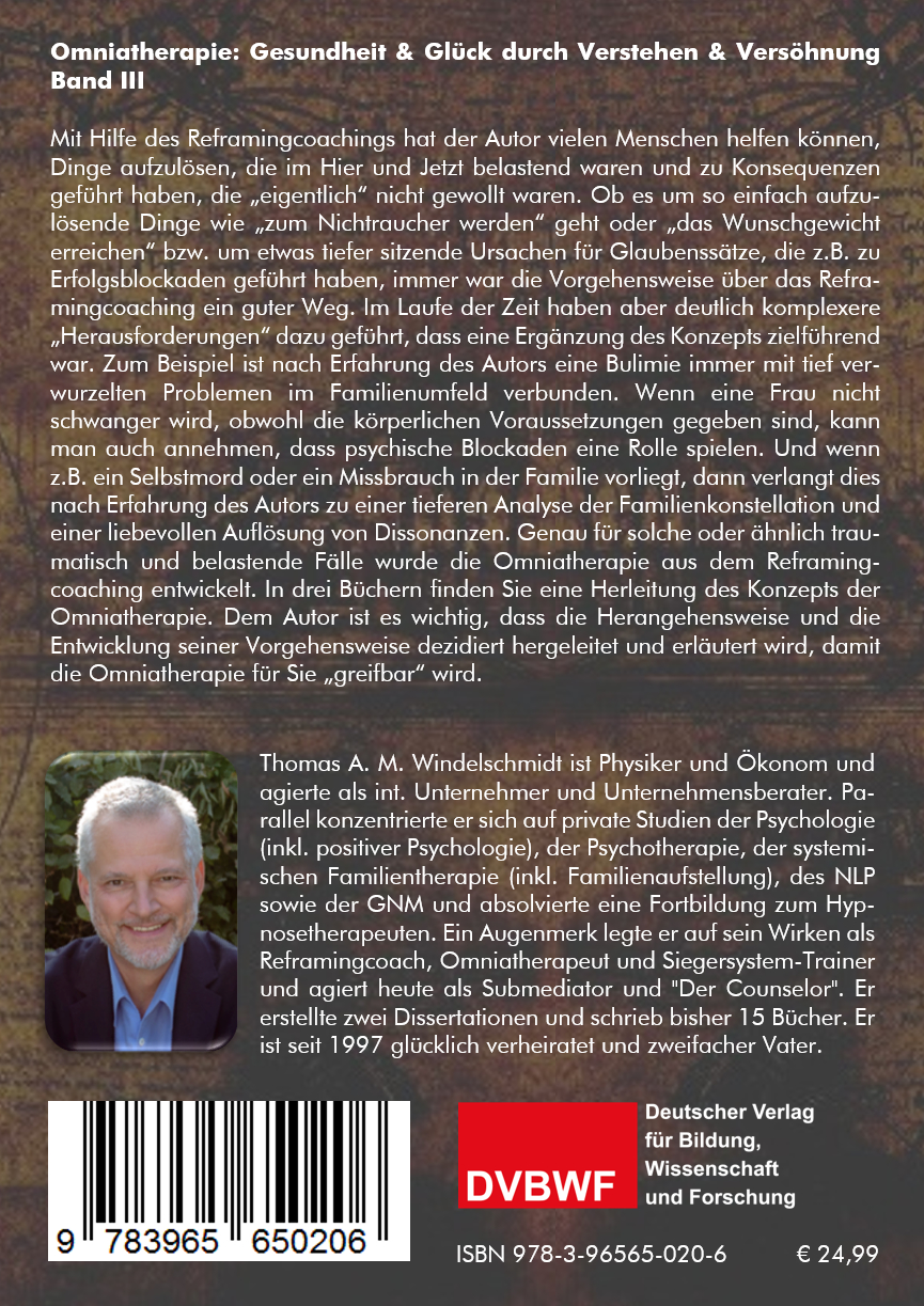Genau für solche oder ähnlich traumatisch und belastende Fälle wurde die Omniatherapie aus dem Reframingcoaching entwickelt. In drei Büchern finden Sie eine Herleitung des Konzepts der Omniatherapie. Dem Autor ist es wichtig, dass die Herangehensweise und die Entwicklung seiner Vorgehensweise dezidiert hergeleitet und erläutert wird, damit die Omniatherapie für Sie „greifbar“ wird.