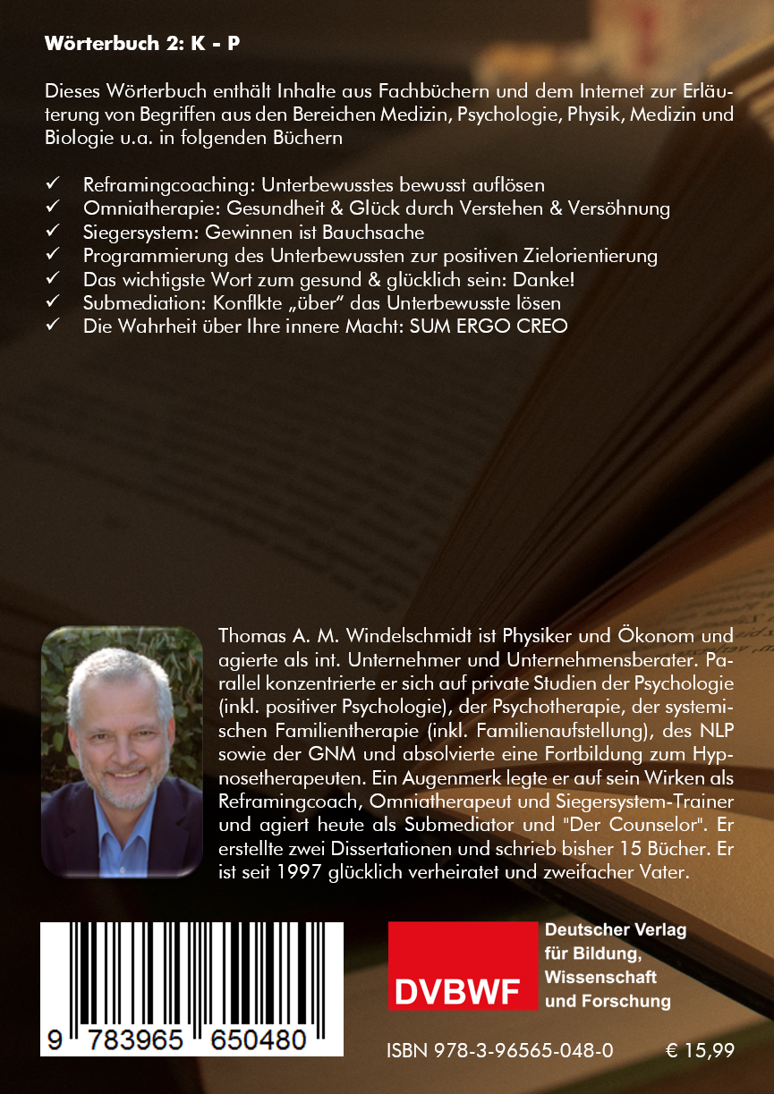 Dieses Wörterbuch enthält Inhalte aus Fachbüchern und dem Internet zur Erläuterung von Begriffen aus den Bereichen Medizin, Psychologie, Physik, Chemie, Biologie und Religion u.a. in folgenden Büchern