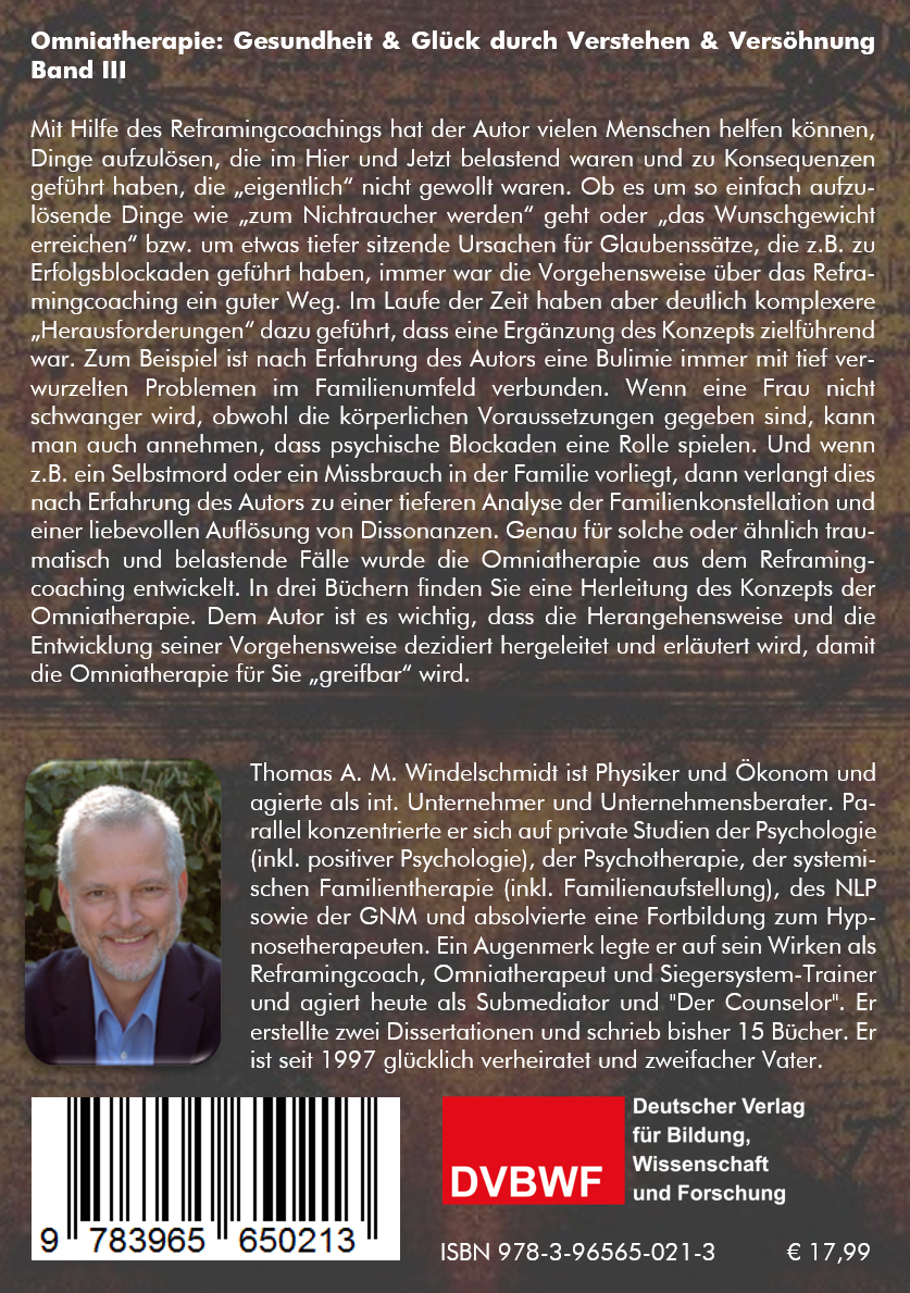 Genau für solche oder ähnlich traumatisch und belastende Fälle wurde die Omniatherapie aus dem Reframingcoaching entwickelt. In drei Büchern finden Sie eine Herleitung des Konzepts der Omniatherapie. Dem Autor ist es wichtig, dass die Herangehensweise und die Entwicklung seiner Vorgehensweise dezidiert hergeleitet und erläutert wird, damit die Omniatherapie für Sie „greifbar“ wird.