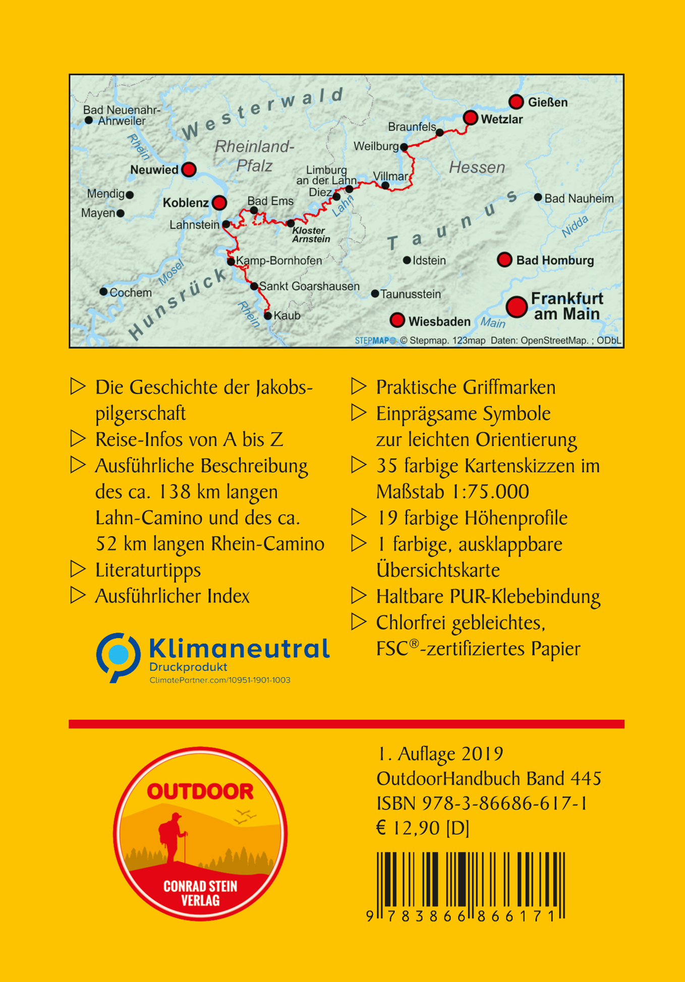 Allgemeines zum Pilgern auf dem Jakobsweg (u. a. Geschichte der Jakobuspilgerschaft, Gründe für die Pilgerschaft, Pilgerstempel), Reise-Infos von A bis Z (u. a. An-/Abreise, Ausrüstung, Einkaufen, Wegmarkierung, Unterkünfte),Wegbeschreibung für Lahn- und Rhein-Camino in 9 Etappen.