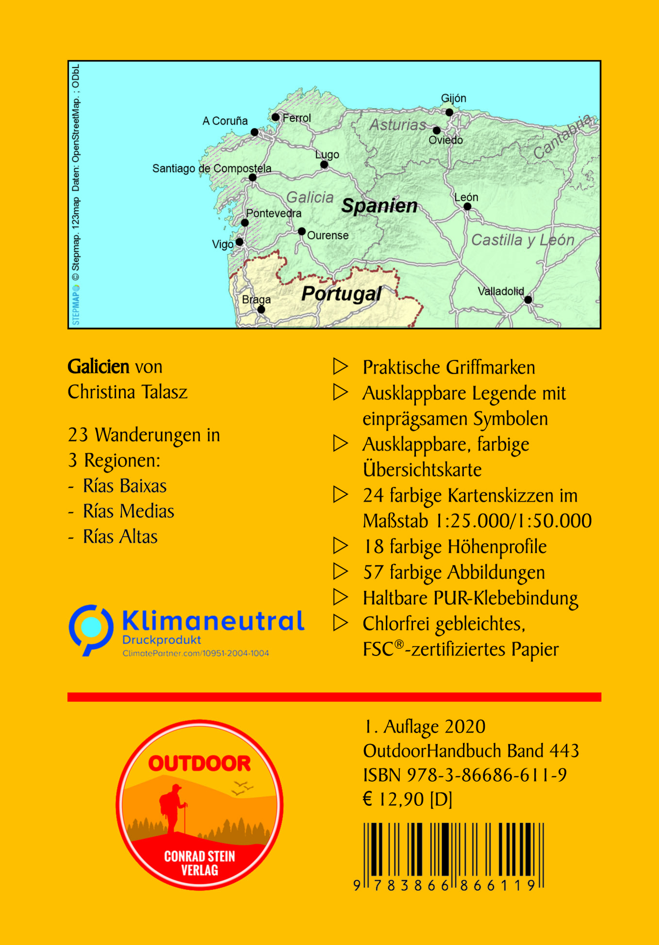 Galicien ist ein wahrer Geheimtipp für natur- und kulturbegeisterte Wanderer - auch abseits der Jakobswege. Das Buch stellt 23 eindrucksvolle Routen entlang der faszinierenden galicischen Atlantikküste vor. Sie wandern entlang paradiesischer Sandstrände und schroffer Klippen, durch malerische Naturschutzgebiete und hinauf auf spektakuläre Aussichtsberge. Dabei kommen Sie auch an jahrtausendealten Dolmen und Felszeichnungen vorbei und lernen die Sagen und Bräuche des Landes kennen. Ein Infoblock zu jeder Tour fasst praktische Hinweise zu Anreise, Einkehrmöglichkeiten, Markierungen, Wandern mit Kind und Hund etc. zusammen. Die detaillierten Wegbeschreibungen, Karten, Höhenprofile und GPS-Tracks erleichtern die Orientierung.