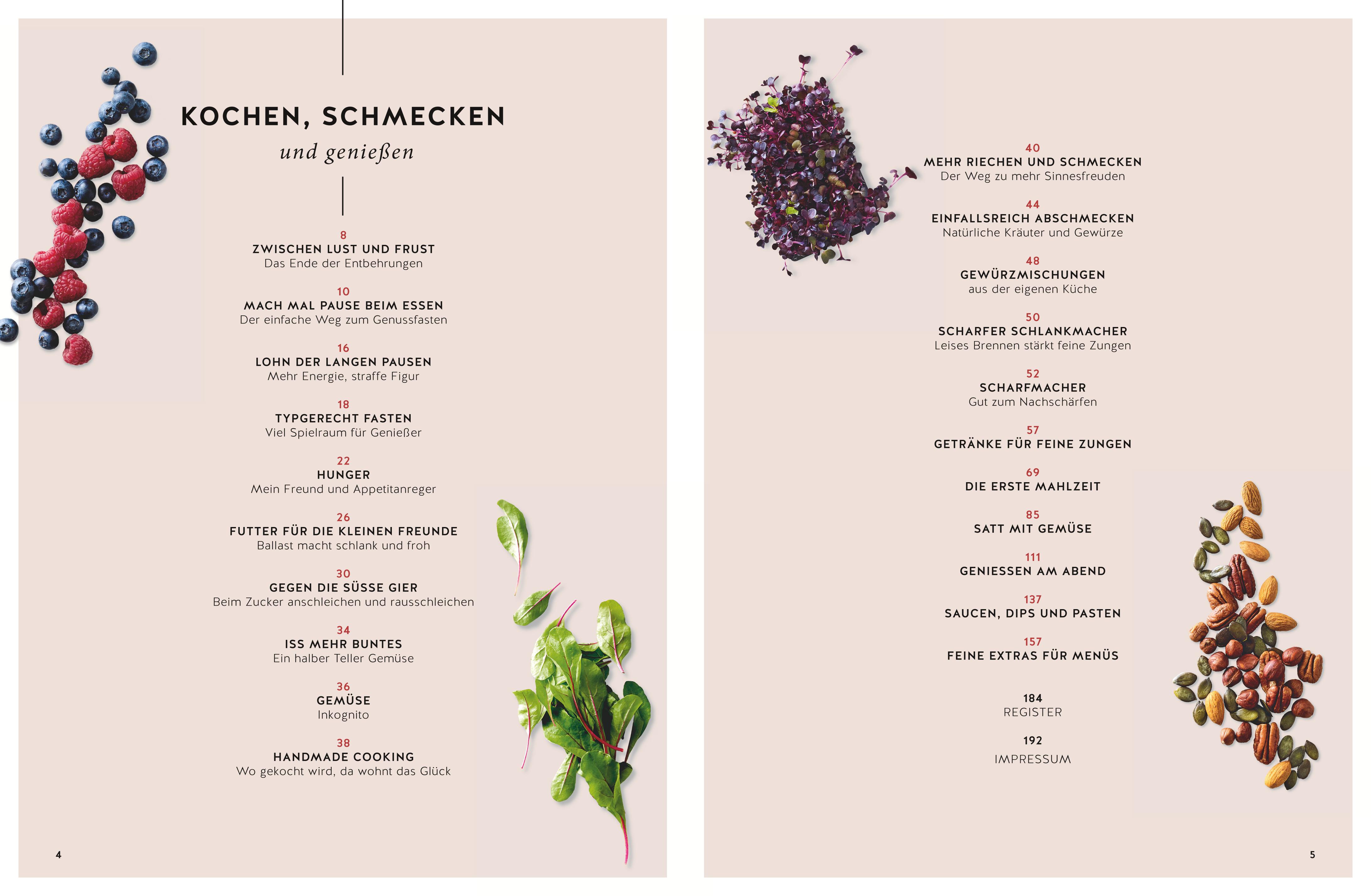 Das Geheimnis: Tagsüber glücklich sattessen. Und dann je nach Fastentypen, die im Buch genau beschrieben werden, einige Stunden lang nichts essen. Ess-Spaß mit Pausen also, in denen der Stoffwechsel Fettpölsterchen abbauen kann. Das Wichtigste dabei: Gesunde Durstlöscher, die den Flüssigkeitshaushalt natürlich unterstützen. Und ausgewogene Gerichte, die für Augen und Gaumen ein Fest sind! Optisch toll angerichtet, mit duftenden Kräutern und Gewürzen, regenbogenbunten Früchten und Gemüsen, gesunden Fetten und Ölen und hochwertigem Fisch und Fleisch.
