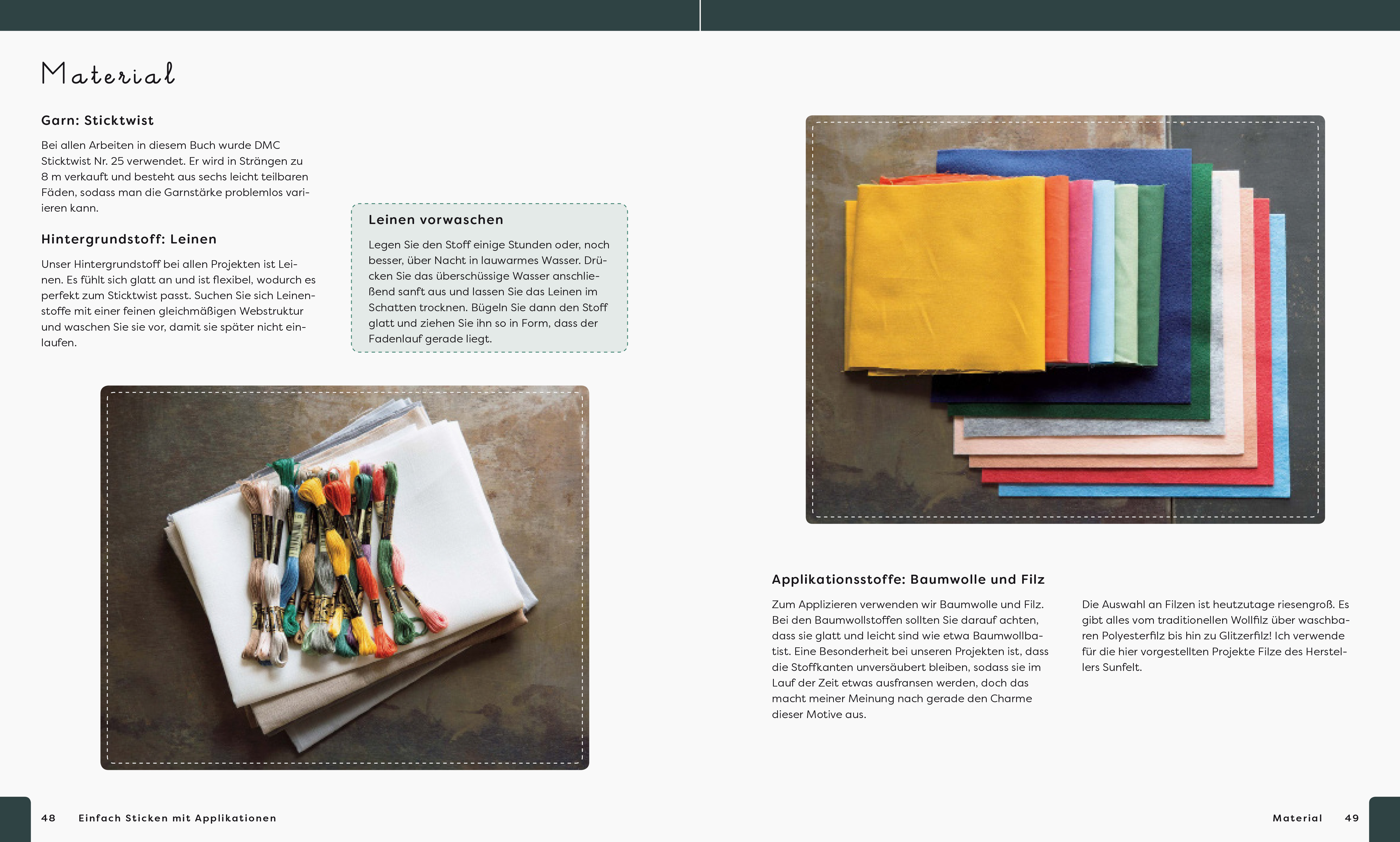 Sticken ist in! Zahlreiche Modemarken verwenden Stickereien und Applikationen auf ihren Kleidungsstücken, und immer mehr Kreative entdecken Sticken als Handarbeitstechnik für sich. Dieses Buch vereint die beiden Techniken Sticken und Appliqué und bietet dem Leser 30 wunderschöne Motive für Handstickerei mit Applikationen. Alle enthaltenen Motive entstammen der Natur: Blumen, Blätter, Vögel und Insekten werden nach den enthaltenen Vorlagen per Hand gestickt und erhalten durch die Kombination mit appliziertem Stoff einen farbenfrohen, haptischen Charakter. Für diejenigen, die nicht nur im Stickrahmen sticken wollen, bietet Einfach Sticken mit Applikationen auch 7 konkrete Stick-Projekte: Nach den Schritt-für-Schritt-Anleitungen können Nadelkissen, Taschen, Untersetzer und Geschirrtücher nachgestickt werden. Der erste Teil des Buchs ist ein »Lookbook« mit großen Bildern der 30 Stickmotive und 7 Stickprojekten, im zweiten Teil werden Sticktechniken und benötigte Stick-Materialien detailliert erklärt. Alle Stickmotive können mit 8 Stickstichen gearbeitet werden, die Motivvorlagen sind in Originalgröße abgebildet und können direkt abgepaust werden.