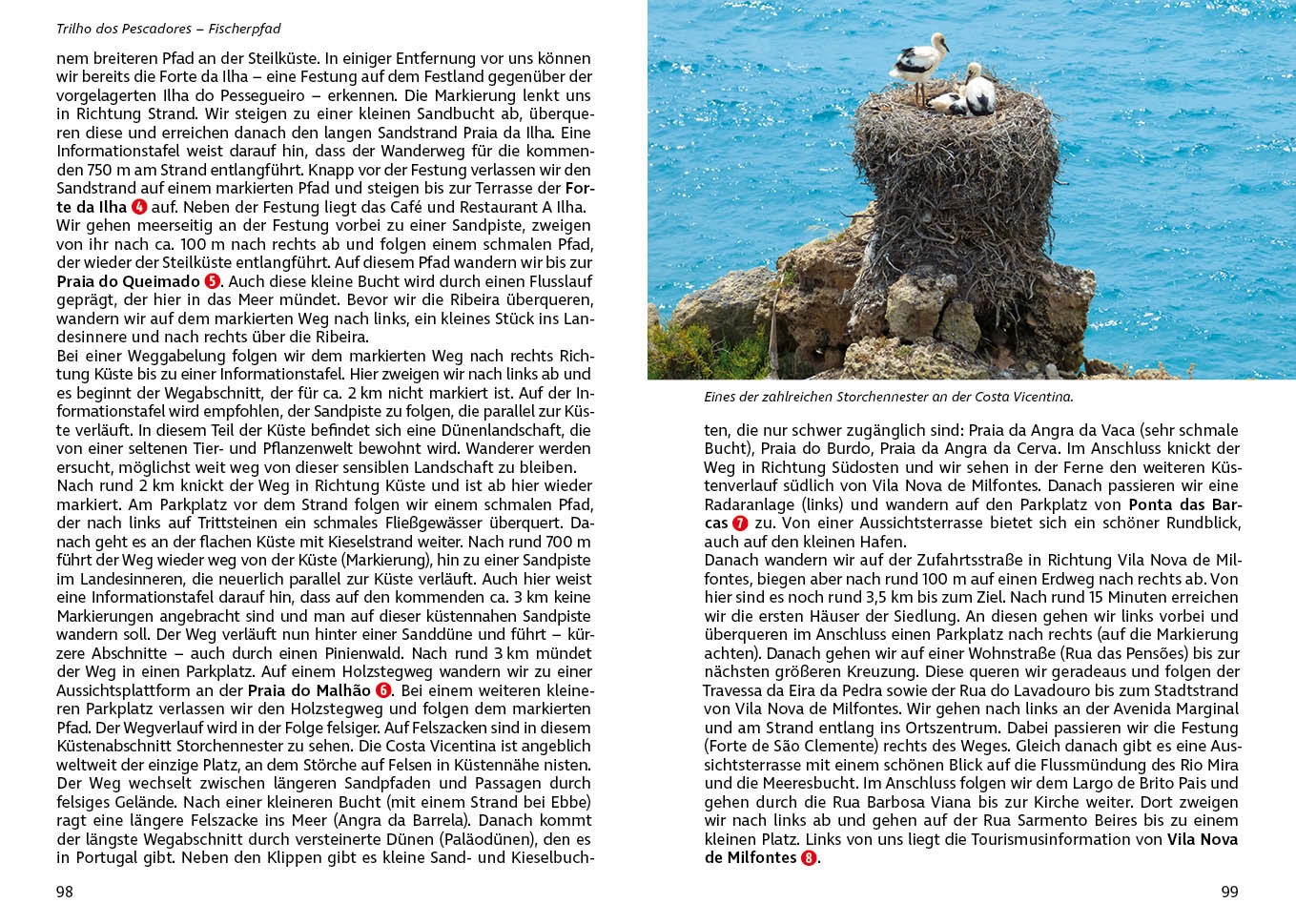 Der »Historische Weg« der Rota Vicentina führt in 13 Etappen von Santiago do Cacém durch kleine Dörfer, fast menschenleere Landstriche und beschauliche Flusstäler. Er endet mit einem grandiosen Finale am Cabo de São Vicente an der Südwestspitze Portugals. Der »Fischerpfad« verläuft in fünf Etappen entlang der unvergleichlichen Steilküstenlandschaft zwischen Porto Covo und Rogil. Wer sich auf Tagestouren die Rosinen herauspicken möchte, kann sich aus neun Rundwanderungen bedienen.