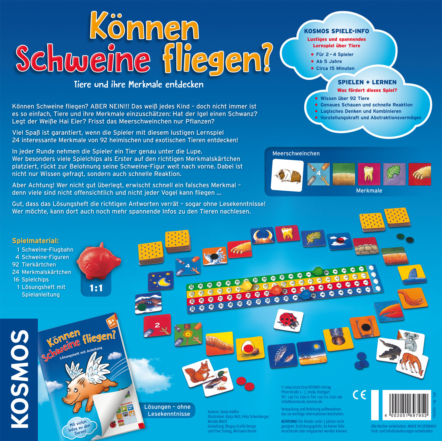 gt; Neuauflage zum Jubiläum des Brettspiel-Klassikers "Können Schweine fliegen?". > Lustiges Kinderspiel für 2 - 4 Spieler. > Gesellschaftsspiel für Kinder ab 5 Jahren. > Spielend Wissen erweitern: das Lernspiel zu Merkmalen der Tiere. > Inkl. Begleitheft mit vielen Informationen aus der Tierwelt. Der Brettspiel-Klassiker wird 15! Schweine können nicht fliegen, das ist doch klar! Aber wie sieht es mit anderen Tieren aus? Ist da auch immer alles so eindeutig? Hat der Igel vielleicht einen Schwanz? Diese und viele andere Fragen rund um kleine und große Tiere, bekannte und exotische Arten, werden in diesem lustigen Kinderspiel ab 5 Jahren beantwortet. So klappt Lernen auf spielerische Art! Spieldauer: ca. 15 Minuten.