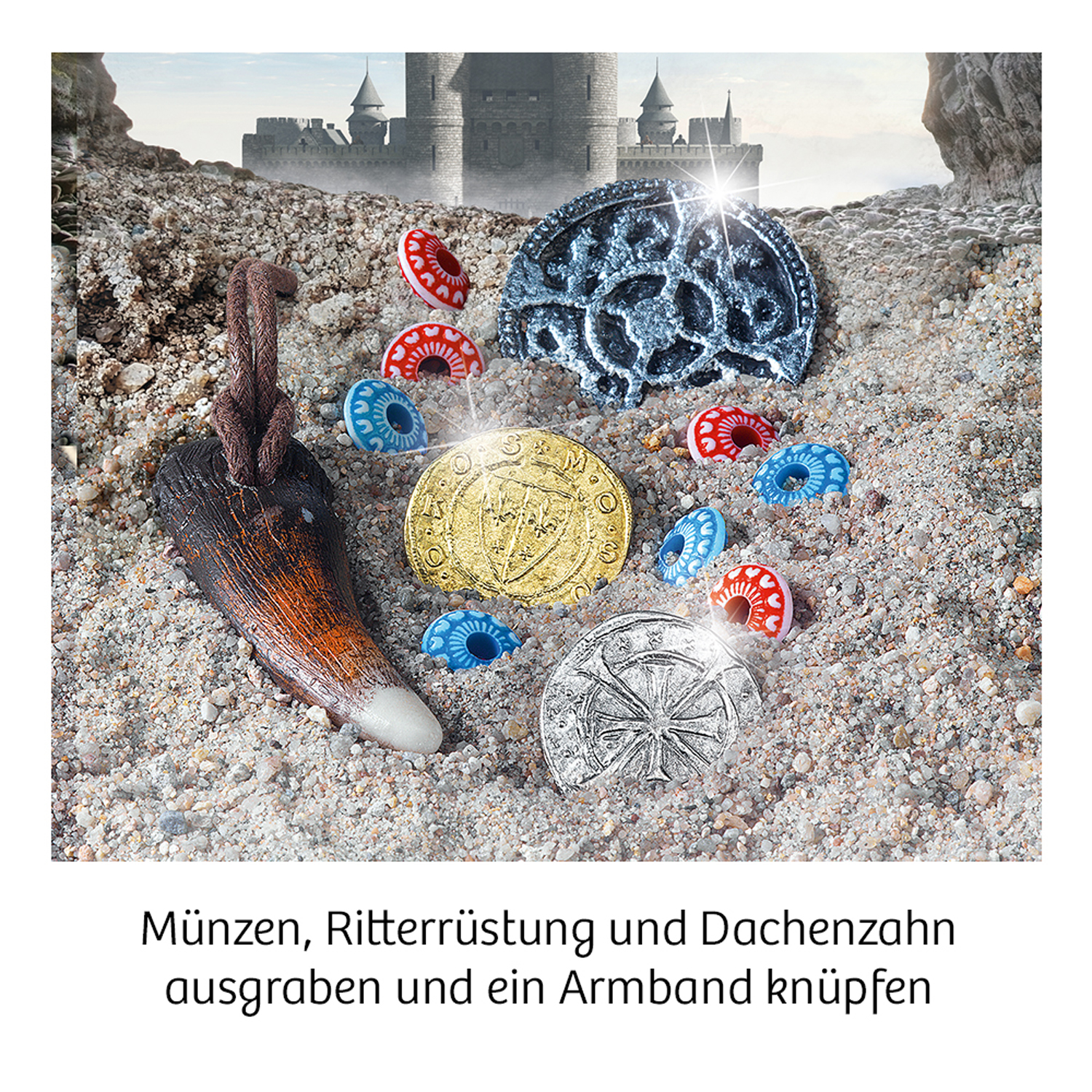 Ein mittelalterlicher Schatz wartet darauf, ausgegraben zu werden! Mit Hammer und Meißel legen kleine Entdecker nach und nach zwei Metall-Münzen, ein Medaillon, verschiedene Spielsteine und einen Drachenzahn aus dem weichen Gips frei. Die farbige Anleitung erklärt die beste Technik beim Ausgraben und verrät spannendes Wissen über Ritter, Drachen und die Arbeit eines Archäologen. Besonders cool: Aus dem freigelegten Zahn und der beiliegenden Schnur entsteht eine tolle Drachenzahn-Kette und beim mittelalterlichen Wurfspiel können die Kids von heute ihre Geschicklichkeit unter Beweis stellen.