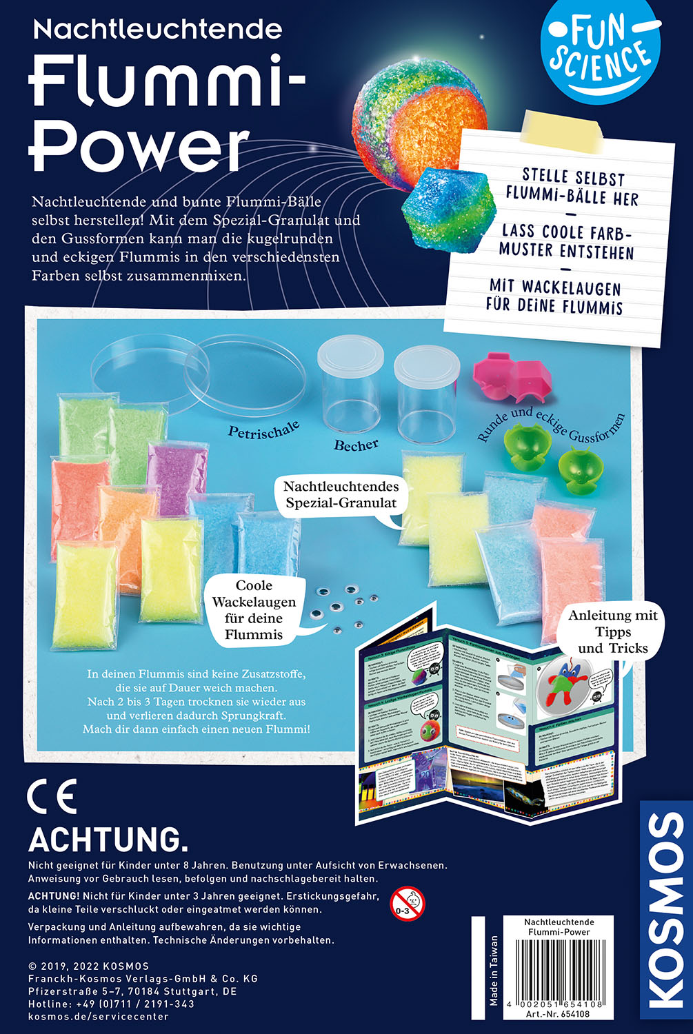 gt; Extra-coole Flummis selbst mixen - in nur 10 Minuten sind die eigenen Kreationen fertig. Welcher springt am höchsten? > Mit dem Spezial-Granulat in 6 Farben und den zusätzlichen 3 nachtleuchtenden Farben lassen sich bis zu 20 Power-Bälle herstellen. Wenn die ersten Bälle nach einigen Tagen ihre Springkraft verlieren, ist auf jeden Fall für Nachschub gesorgt! > Mit zwei verschiedenen Gussformen für kugelrunde und eckige Springbälle sowie den witzigen Wackelaugen kommt Abwechslung ins Spiel. > Auch in der Natur gibt es nachtleuchtende Farben - das erfahren Kinder von 8 - 12 Jahren in spannenden Info-Texten und Fun-Facts. > Ein KOSMOS Experimentierset zum sofort Durchstarten, Spaß haben und Wissen sammeln! Welcher Flummi springt am höchsten? Wer hat den schönsten Hüpfball? In nur zehn Minuten finden Kinder das mit diesem KOSMOS Experimentierset heraus! Mit dem Spezial-Granulat und den verschiedenen Gussformen können 8- bis 12-Jährige kugelrunde und eckige Springbälle in den verschiedensten Farben selbst zusammen mixen. Besonders cool ist der nachtleuchtende Flummi, der bei Dunkelheit hell leuchtet. Bekommt er dann noch ein Paar Wackelaugen verpasst, wird's richtig lustig. Sind die ersten Bälle nach einigen Tagen durchgetrocknet und haben ihre Sprungkraft verloren, müssen neue her. Wie gut, dass das Granulat in diesem Set für bis zu 20 Power-Bälle reicht! Spannende Info-Texte und Fun-Facts erklären, warum manche Farben im Dunkeln leuchten und wie sich zum Beispiel die Tiere der Tiefsee das zu Nutze machen.