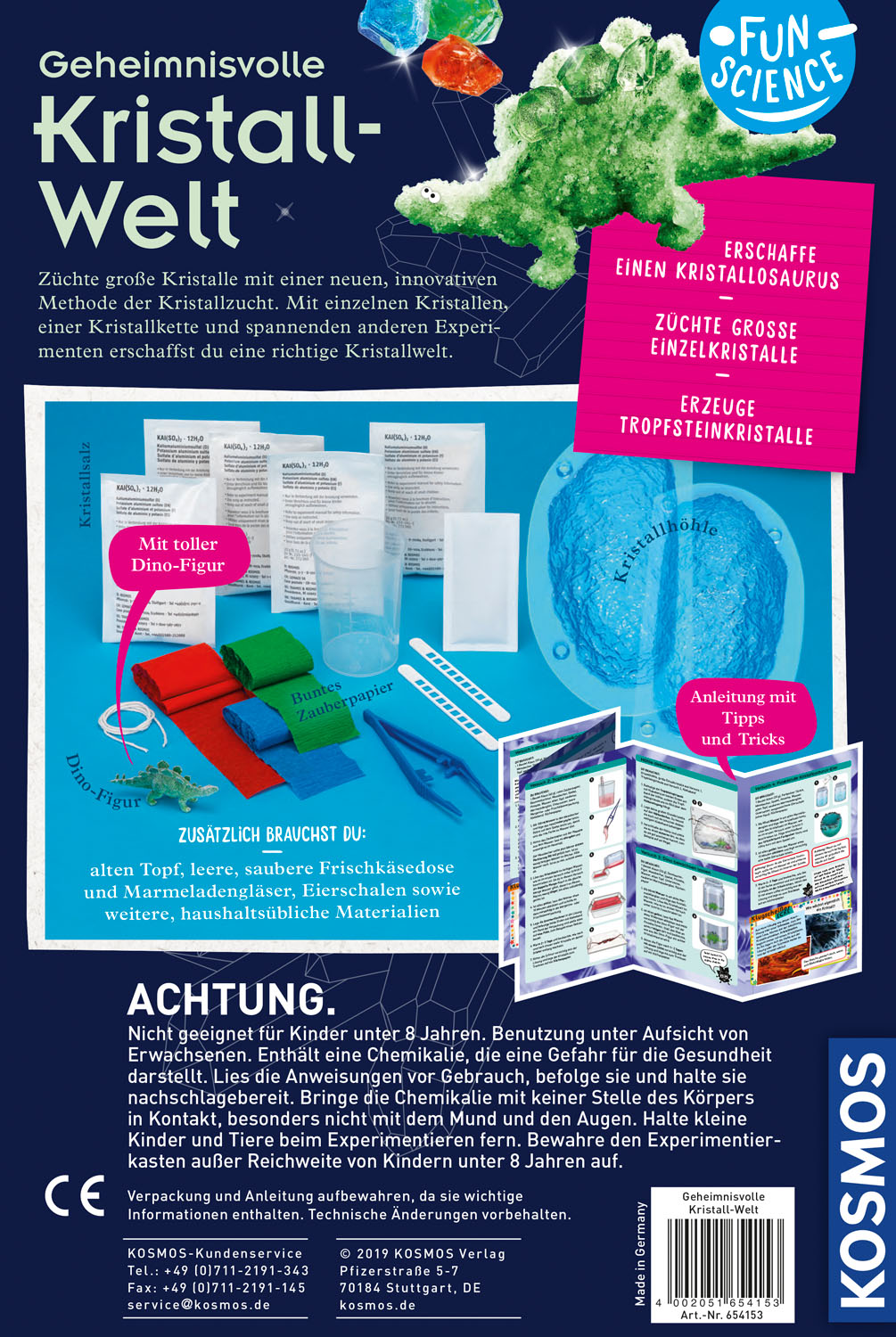 gt; Riesige Einzelkristalle in den tollsten Farben: Innovative Zucht- und Färbemethoden machen es möglich. Das ideale Set für Kinder von 8 bis 12 Jahren. > Schneller Zuchterfolg garantiert: Bereits nach einem Tag wachsen die Kristalle zu dekorativen Girlanden oder überziehen eine coole Dino-Figur > Die schönsten Exemplare dekorieren die Kinder in einer magischen Kristallhöhle und präsentieren ihren Schatz im Kinderzimmer. > Mit spannenden Info-Texten und Fun-Facts über Kristallsalze und ihre Formen. > Ein KOSMOS Experimentierset für einen tollen und sicheren Start in die Welt der Chemie - glitzernd, bunt und kreativ. Riesige Einzelkristalle, einen Glitzer-Dino und Kristallgirlanden in den tollsten Farben züchten: Innovative Zucht- und Färbemethoden machen es möglich! Schon nach einem Tag sprießen die ersten glitzernden Kristalle und entwickeln sich zu wahren Wunderwerken. Mit den schönsten Stücken aus diesem KOSMOS Experimentierkasten dekorieren die Kinder eine magische Kristallhöhle und inszenieren ihre funkelnde Welt im Kinderzimmer. Mit spannenden Info-Texten und klugen Fun-Facts über Kristallsalze und ihre Formen. Ein toller und sicherer Start in die Welt der Chemie - glitzernd, bunt und kreativ. Von 8 bis 12 Jahren.