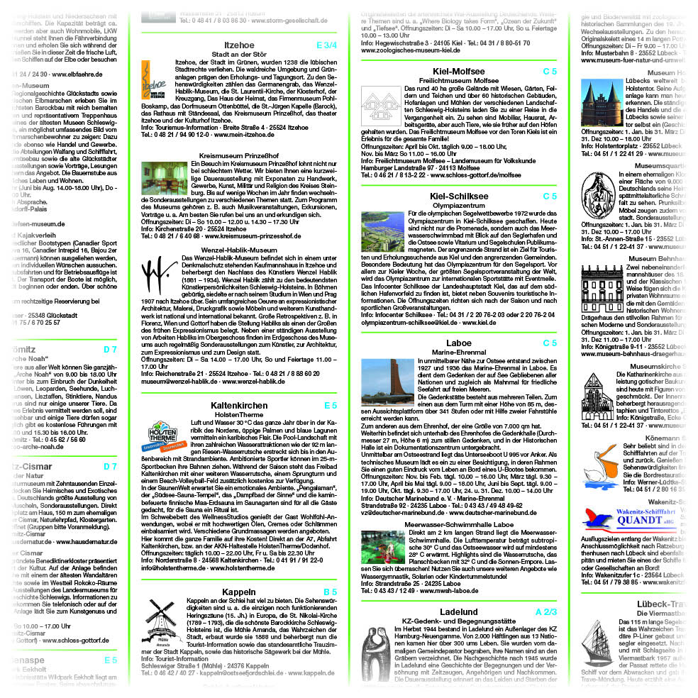 Wer im hohen Norden auf Entdeckungstour gehen möchte, für den ist der Erlebnisführer Schleswig-Holstein genau das Richtige. Das Land zwischen Nord- und Ostsee lockt seine Besucher mit dem UNESCO-Weltnaturerbe Wattenmeer, Naturschutzgebieten und zwei Naturparks. Aber neben der Natur und dem landschaftlichen Erlebnis steht natürlich auch das kulturelle: Ferienparks, Museen, Thermen und interessante Städte wie Flensburg, Kiel und Lübeck laden zum Verweilen und Entdecken ein. Nähere Infos zu den vielseitigen touristischen Angeboten im "Land zwischen den Meeren" bietet die Kartenrückseite.
