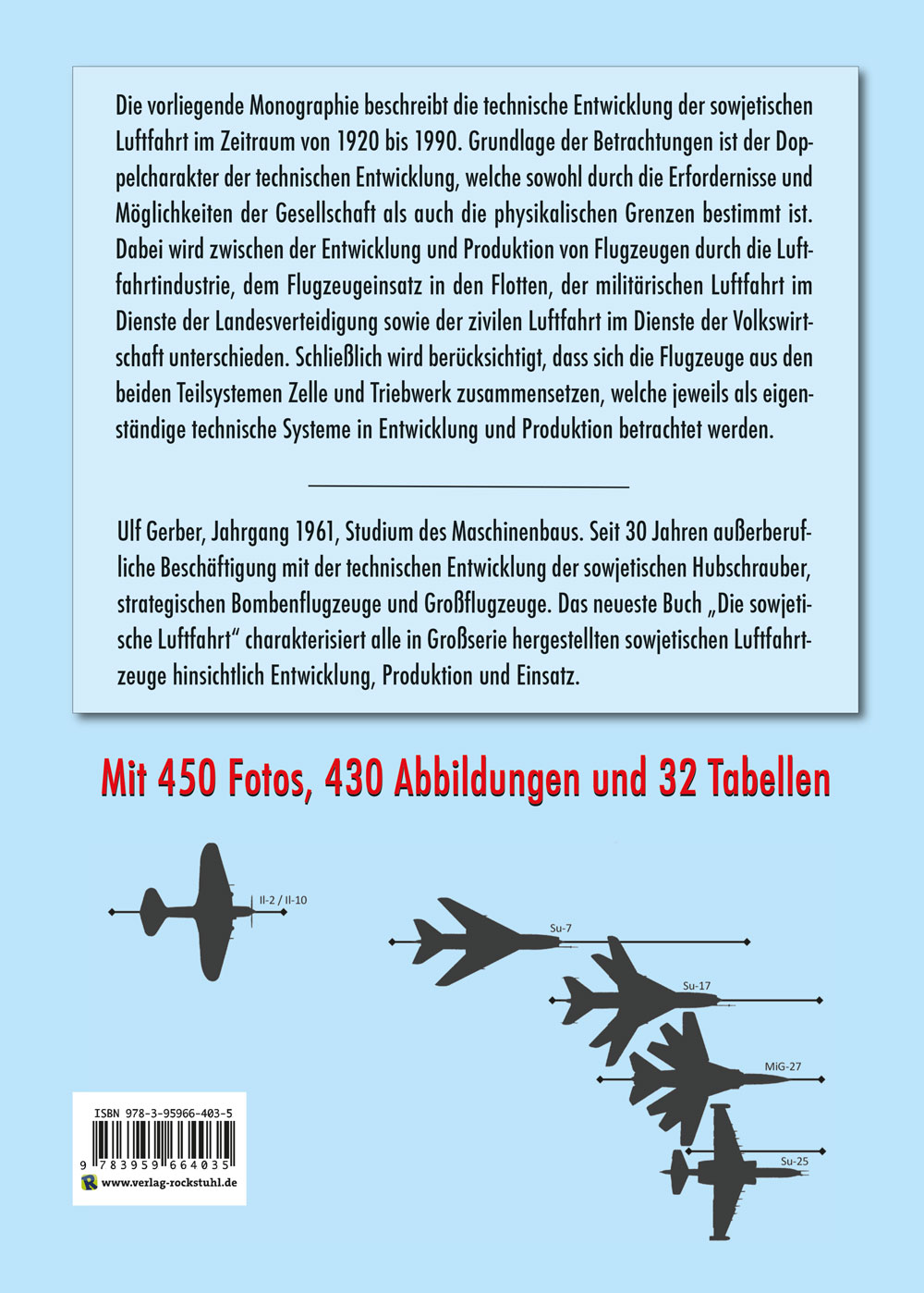 Ulf Gerber, Jahrgang 1961, Studium des Maschinenbaus. Seit 30 Jahren außerberufliche Beschäftigung mit der technischen Entwicklung der sowjetischen Hubschrauber, strategischen Bombenflugzeuge und Großflugzeuge. Das neueste Buch „Die sowjetische Luftfahrt“ charakterisiert alle in Großserie hergestellten sowjetischen Luftfahrtzeuge hinsichtlich Entwicklung, Produktion und Einsatz.