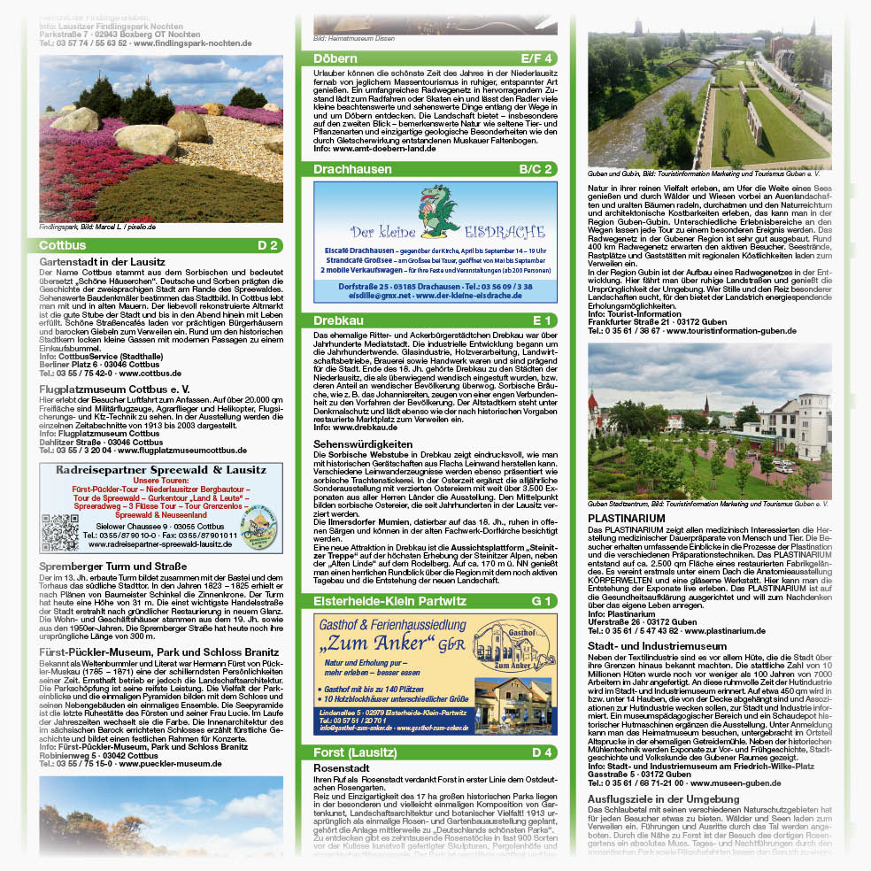 Über die Radwanderkarte Spree - Neiße - Cottbus, Fürst-Pückler-Region: Der gewählte Kartenausschnitt präsentiert eine interessante Landschaft. Die im Kartenteil markierten und auf der Rückseite erläuterten Radwege führen durch die ehemalige Braunkohletagebauregion der Lausitz. Einige Abbaugebiete sind noch im Originalzustand zu sehen, andere werden durch Flutung bereits in ein seenreiches Erholungsgebiet verwandelt. Zudem reizvoll: grenzüberschreitende Radwege entlang von Oder und Neiße, die eine unberührte Landschaft am ehemaligen "Eisernen Vorhang" erleben lassen. Weitere Infos gibt's auf der Rückseite der Radwanderkarte Spree - Neiße - Cottbus.