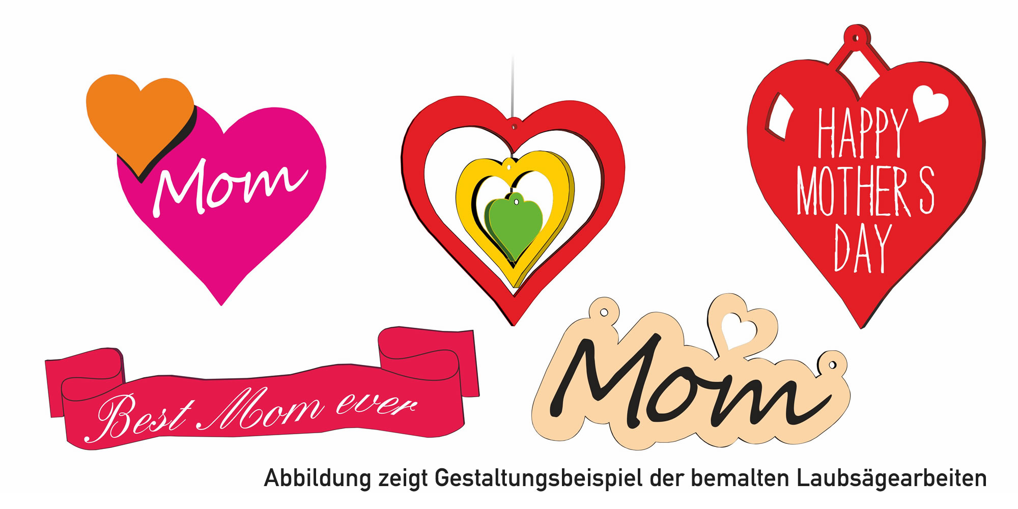 Laubsägevorlage für fünf wunderschöne Muttertags-Elemente aus hochwertigem 3mm Pappelsperrholz.