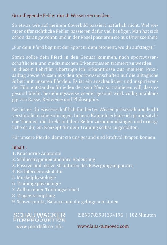 Es ist ein anschaulicher und inspirierender Film entstanden für jeden der sein Pferd so trainieren will, dass es gesund bleibt, beziehungsweise wieder gesund wird, völlig unabhängig von Rasse, Reitweise und Philosophie.