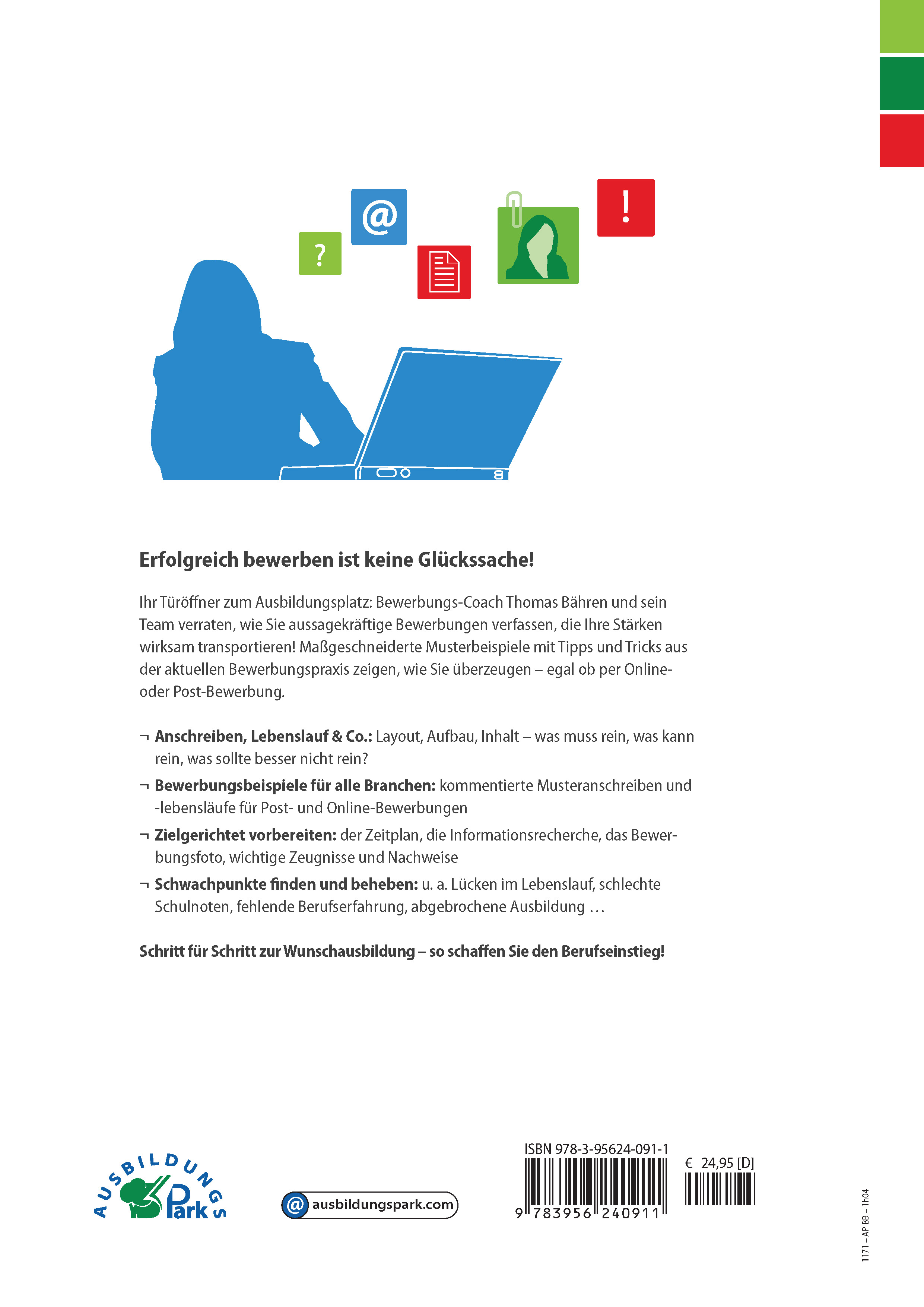 - Schwachpunkte finden und beheben: u. a. Lücken im Lebenslauf, schlechte Schulnoten, fehlende Berufserfahrung, abgebrochene Ausbildung ...