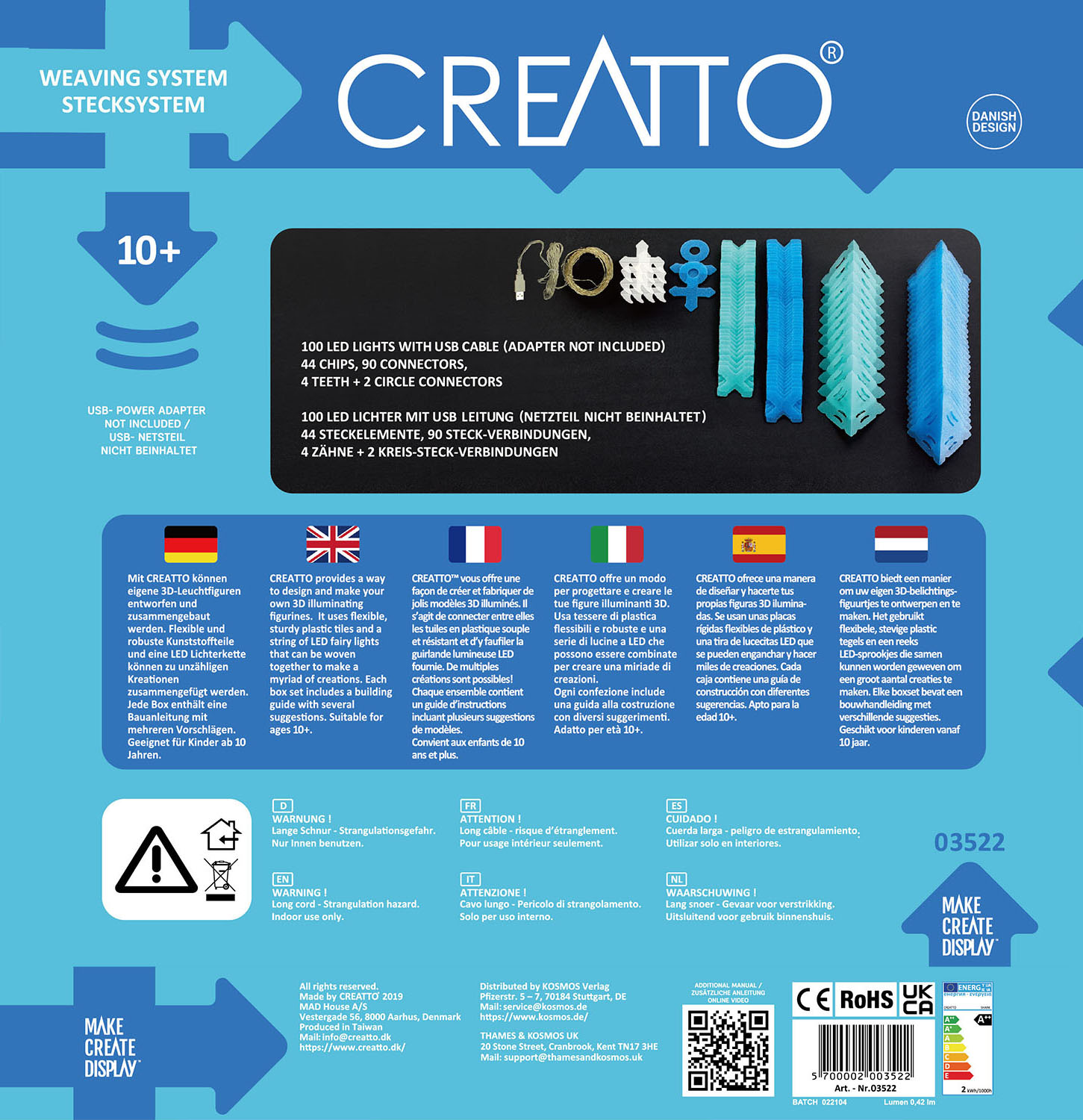 Das Creatto-Set wird verkauft mit einem Leuchtmittel der Effizienzklasse C (Spektrum A bis G). Das Energieeffizienz-Etikett befindet sich auf der Verpackungsseite.