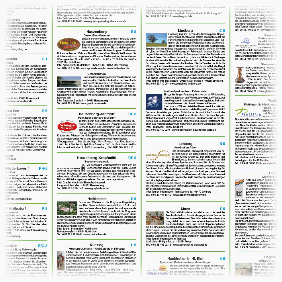 Der Kartenteil des Erlebnisführers Bayerischer Wald stellt eine interessante Region in den Mittelpunkt: Im Norden und Osten geprägt durch Wälder und den Großen Arber, im Süden und Westen bestimmen Donau und Isar das Landschaftsbild, ebenso die Städte Regensburg und Passau. Welche Sehenswürdigkeiten hier oder in kleineren Orten auf Besucher warten, welche sportlichen und naturverbundenen Aktivitäten im Bayerischen Wald angeboten werden, erfährt man gut zusammengefasst auf der Rückseite des Erlebnisführers Bayerischer Wald.