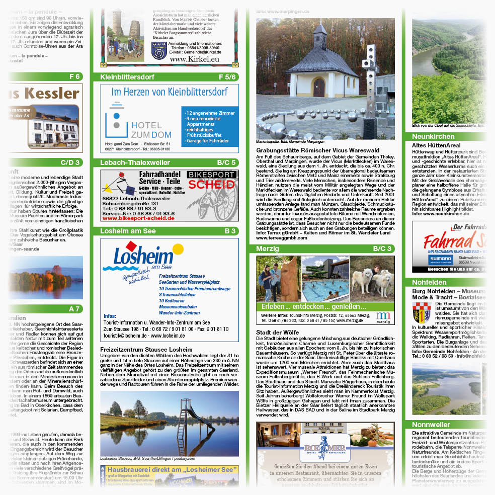 Dass 16 Radwege in den Kartenausschnitt des Saarlandes eingetragen sind, zeugt von einer für Radler gut erschlossenen Landschaft. Erwähnenswert sind grenzüberschreitende Radwege um Saarbrücken nach Frankreich und die Kondition erfordernden Touren durch den Naturpark Saar-Hunsrück und die Westpfalz. Eigens markierte Mountainbike-Strecken um St. Wendel belegen die starken Steigungen. Infos zu Städten und kleineren Orten gibt es auf der Rückseite.