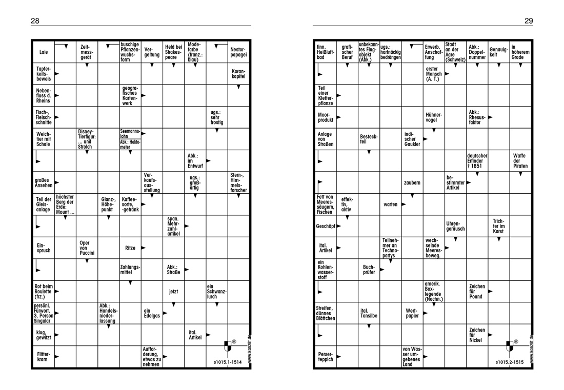Zahl einfügen neue Kreuzworträtsel lassen keine Zeit für Langeweile. Wer sie löst schult Geist und Verstand, bestätigt und ergänzt auf unterhaltsame Weise Wissen und Kombinationsvermögen. Ob allein oder in Gesellschaft, ob daheim oder unterwegs – Rätselfreunde werden begeistert sein.