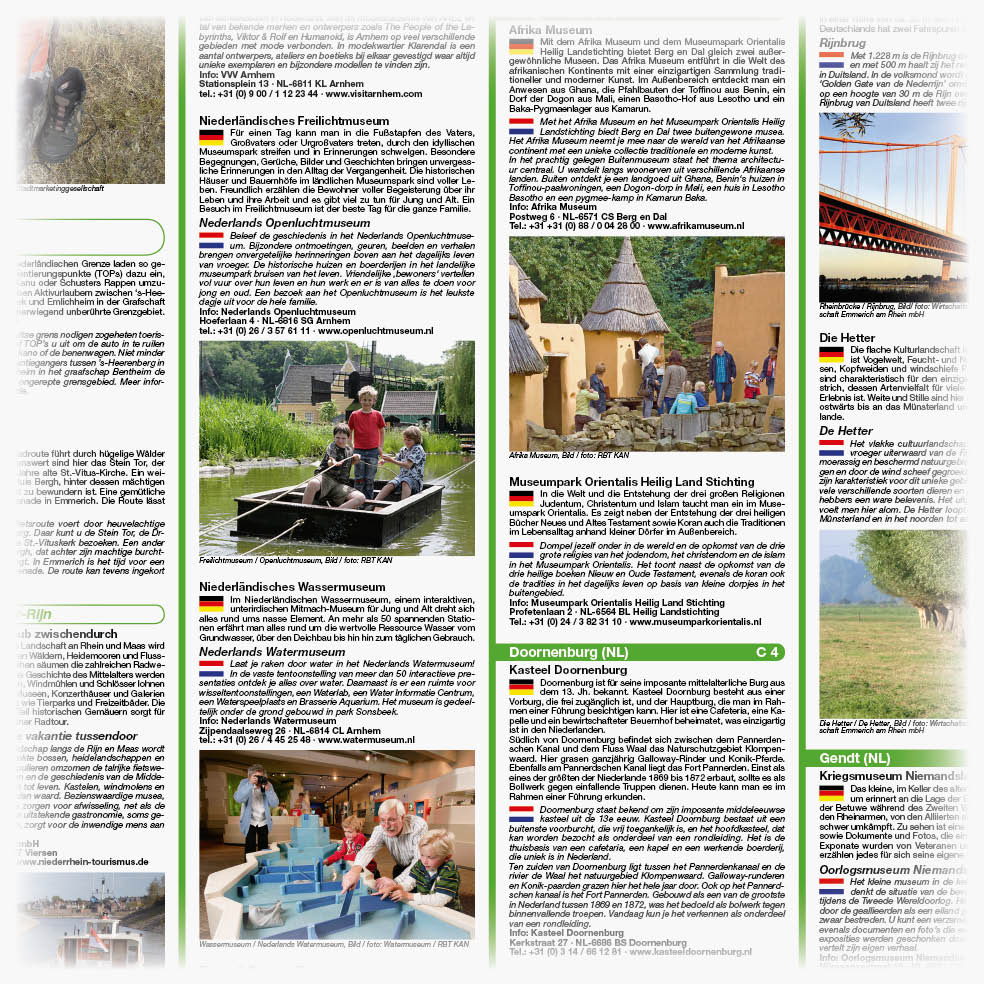 Die Rad- und Wanderkarte ANKE (Arnhem - Nijmegen - Kleve - Emmerich) informiert in deutscher und niederländischer Sprache über das Grenzgebiet am Niederrhein. Dass dieses flache Gebiet sich besonders für Radler eignet, zeigen die 11 in die Karte eingezeichneten, weitgehend grenzüberschreitenden Fernradwege, die im Infoteil näher beschrieben werden. Hinweise für Ausflugstipps und lohnende Zwischenstopps gibt es ebenfalls auf der Rückseite der Rad- und Wanderkarte ANKE.
