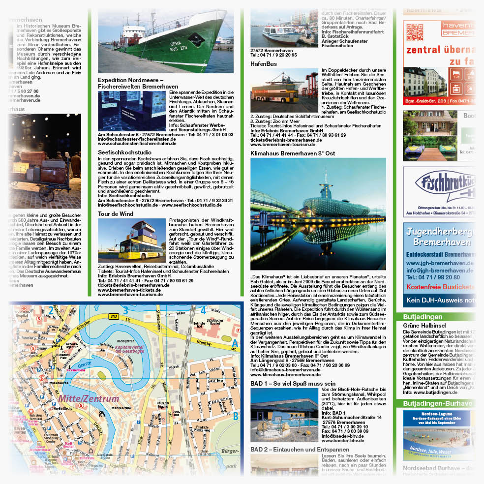 Im Mündungsbereich der Weser in die Nordsee gibt es viel zu entdecken. Die Halbinsel Butjadingen bietet sich für Radler und Wanderer gleichermaßen an: Markierte Rad- und Wanderwege ermöglichen eine Erkundung der von Mooren durchzogenen Landschaft und eine Berührung mit dem Nationalpark Niedersächsisches Wattenmeer. Auf der anderen Seite der Weser wartet Bremerhaven mit maritimen Sehenswürdigkeiten auf Besucher. Die Rückseite der Rad- und Wanderkarte informiert auch umfassend über Sehenswürdigkeiten in der gesamten Region.