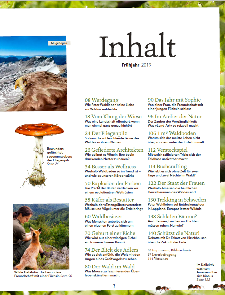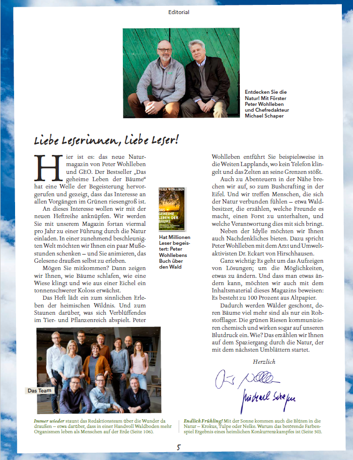 Ein Naturmagazin von GEO und Peter WohllebenWOHLLEBENS WELT steht für die Erfüllung der Sehnsucht nach Natur und Entschleunigung und für eine verständliche und unterhaltsame Wissensvermittlung über die Phänomene der Tier- und Pflanzenwelt und der Natur. Es inspiriert den Leser, mehr Zeit in der Natur zu verbringen und hat mit Peter Wohlleben den besten nur denkbaren Protagonisten, Autor, Ratgeber und Kommentator an seiner Seite. Peter Wohlleben wird im Magazin in Form längerer Reportagen, Bildstrecken, Essays und Rubriken merklich präsent sein.Peter Wohlleben und die Redaktion liefern ihren Lesern einen neuen Blick auf die Natur. Dabei geht es nicht nur in den Wald, sondern es geht in der Heimat auf die Wiese, ins Watt, ins Gebirge, ins Moor und aufs Meer. Und auch in Exkursen hinaus in die Welt. WOHLLEBENS WELT schafft ein Staunen über die Wunder der belebten Welt und zeigt, dass Wissen über die Natur Spaß machen kann.