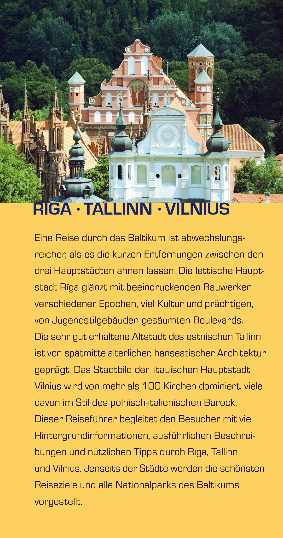 VORWORTWie eindeutig die drei Staaten des Baltikums zum Kulturkreis Mitteleuropas gehören, wird in den Hauptstädten offensichtlich. Die Architektur Tallinns ist hanseatisch. Viele Speicherhäuser der fast vollständig erhaltenen und von einer zwei Kilometer langen Stadtmauer umgebenen Altstadt stammen von deutschen Kaufleuten. Sie waren im Spätmittelalter im Russlandhandel tätig oder verschifften ihre Waren ins westliche Europa. Jenseits der Altstadt mit ihren Museen, Plätzen, Cafés und touristischen Dienstleistungen strecken sich die verglasten Bürotürme eines Landes in den Himmel, das innerhalb der EU mit seiner niedrigen Staatsverschuldung und weit fortgeschrittener Digitalisierung aller Lebensbereiche ein Vorreiter ist. An vielen Stellen der heute 450 000 Einwohner zählenden estnischen Hauptstadt ist wegweisende moderne Architektur zu sehen. Im Stadtteil Kalamaja konnten sich Alternativkultur und künstlerische Freiräume wie in nur wenigen anderen Europas entwickeln.In der Altstadt Rigas wurden die hanseatischen Speicherhäuser aufgrund des Platzmangels teilweise überbaut, man findet heute Bauten aus allen Architekturepochen seit dem 12. Jahrhundert. Die mächtige, die Stadt einengende Stadtmauer wich im 19. Jahrhundert einem Ring von Parkanlagen, in denen heute Museen, das Opernhaus und viele weitere öffentliche Gebäude stehen. Jenseits davon wurden von vielstöckigen Jugendstilbauten gesäumte Boulevards angelegt. Dort und in der im Hochsommer mit zahlreichen Straßencafés und Biergärten bestückten Altstadt zeigt die 650 000 Einwohner zählende lettische Hauptstadt die Geschäftigkeit einer wirklichen Metropole.In der 575 000 Einwohner zählenden litauischen Hauptstadt Vilnius hat der Barock polnisch-italienischer Prägung deutliche Spuren im Stadtbild hinterlassen. Zu den wichtigen der rund 100 Kirchen der Stadt zählen St. Peter und Paul mit rund 2000 weißen Stuckfiguren und das Ausros-Tor mit der Ikone der Barmherzigen Muttergottes, eine weltweit unter Katholiken bekannte Wallfahrtsstätte. Vilnius war jahrhundertelang auch ein geistiges Zentrum jüdischen Lebens; die Stadt galt bis zum Holocaust als »Jerusalem des Nordens«. Das Museum der Genozidopfer im Stadtzentrum erinnert an die von den Sowjets durchgeführten Deportationen zehntausender Litauer, an die Partisanenbewegung und an den Holocaust. Den Schrecken des 20. Jahrhunderts zum Trotz ist Vilnius eine sehr lebensfrohe, bunte Stadt: Die Cafés und Sommerterrassen der Altstadt sind im Sommer auch dank der vielen Studenten und Gaststudenten der traditionsreichenUniversität brechend voll, und es gibt viele Open-Air-Veranstaltungen.Trotz vieler positiver Entwicklungen haben die drei baltischen Staaten aufgrund des Lohngefälles mit einer massiven Abwanderung in Richtung Westeuropa zu kämpfen - rund 15 Prozent der Bevölkerung haben das Baltikum mittlerweile verlassen, und sehr viele werden wohl nicht zurückkehren. Der Tourismus konzentriert sich jenseits der drei Hauptstädte an wenigen weiteren Orten und Städten, die alle in diesem Reiseführer beschrieben werden.Vor allem in den Nationalparks des Baltikums wird man nicht nur großartige Naturerlebnisse haben, sondern meist auch eine gut funktionierende Infrastruktur vorfinden.