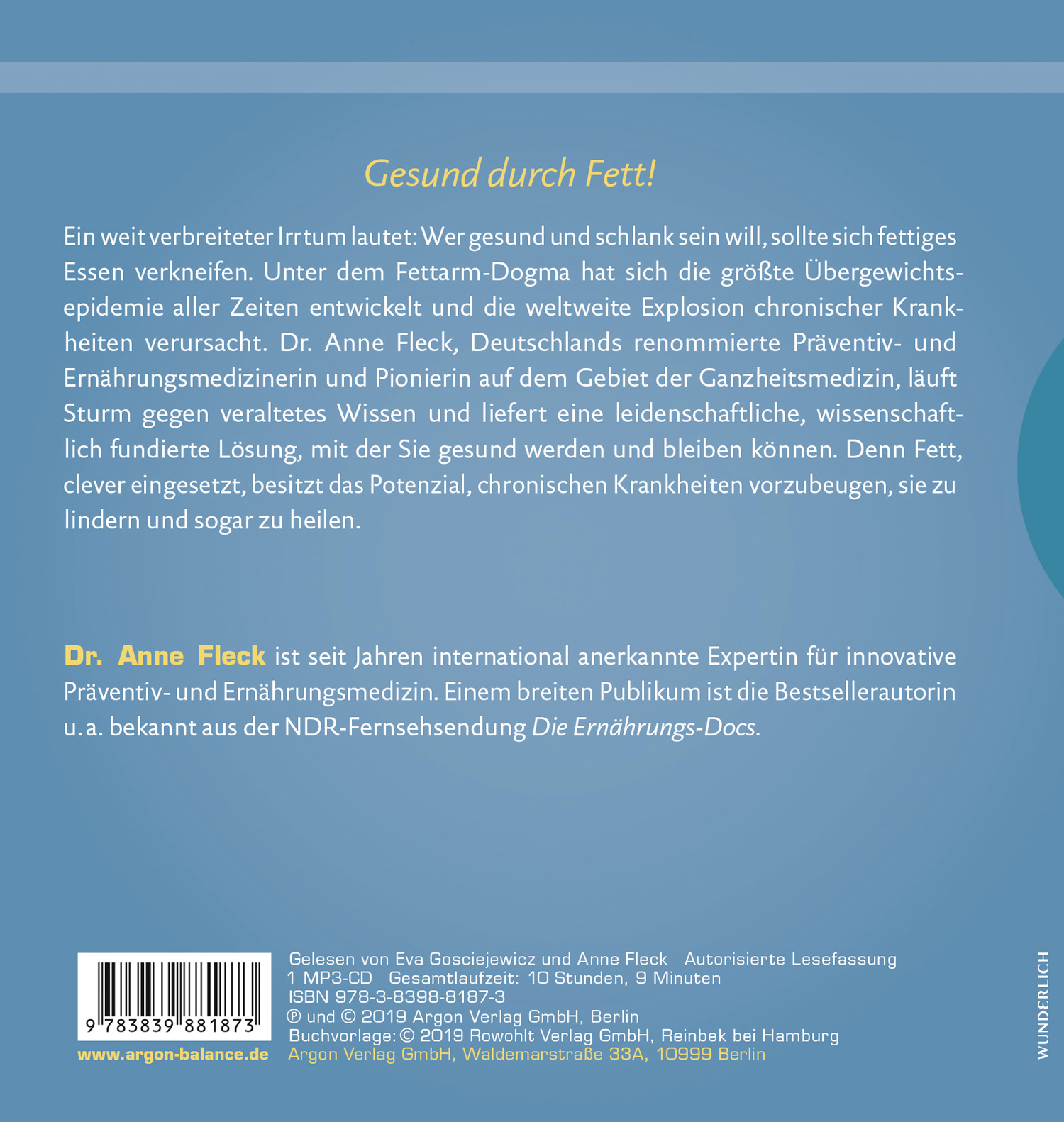 Ein weit verbreiteter Irrtum lautet: Wer gesund und schlank sein will, sollte sich fettiges Essen verkneifen. Unter dem Fettarm-Dogma hat sich die größte Übergewichtsepidemie aller Zeiten entwickelt und die weltweite Explosion chronischer Krankheiten verursacht. Dr. Anne Fleck, Deutschlands renommierte Präventiv- und Ernährungsmedizinerin und Pionierin auf dem Gebiet der Ganzheitsmedizin, läuft Sturm gegen veraltetes Wissen und liefert eine leidenschaftliche, wissenschaftlich fundierte Lösung, mit der Sie gesund werden und bleiben können. Denn Fett, clever eingesetzt, besitzt das Potenzial, chronischen Krankheiten vorzubeugen, sie zu lindern und sogar zu heilen.