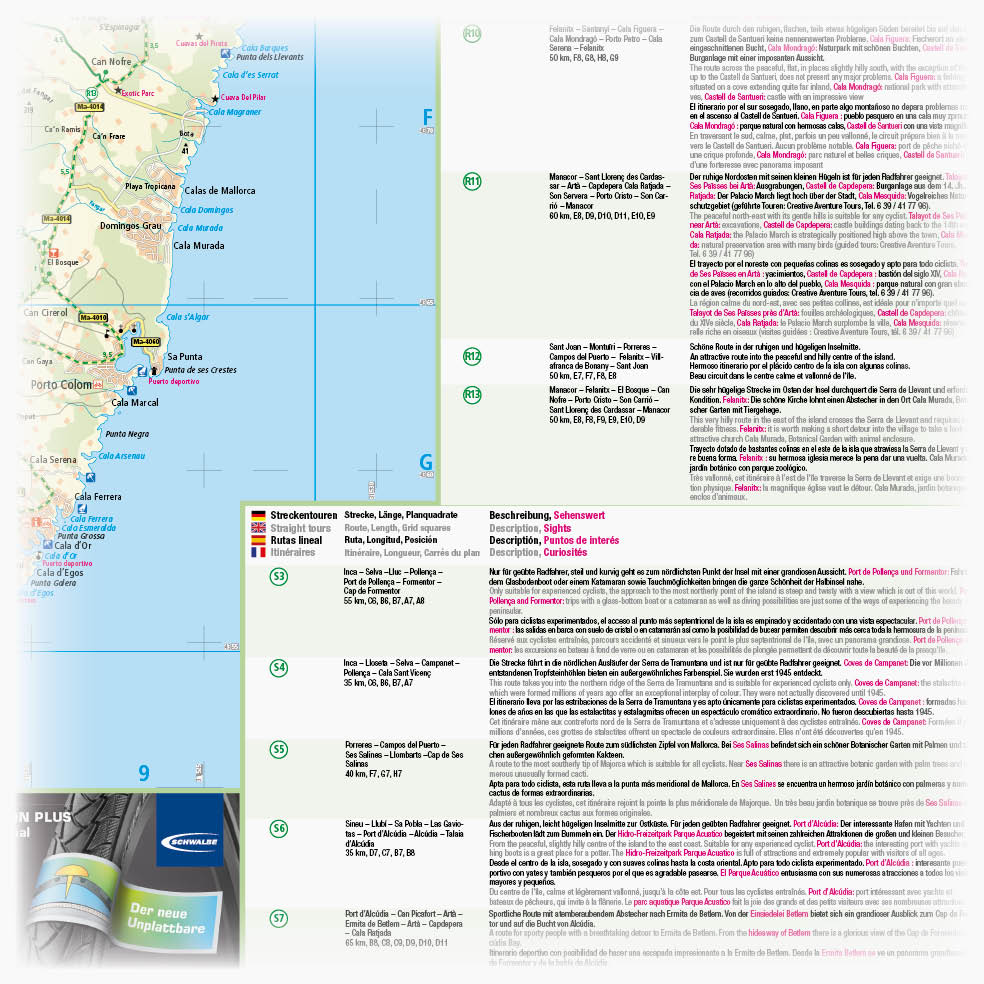Mallorca ist ein echtes Radfahrerparadies mit zahlreichen Radstrecken, die als Rund- und Streckentouren mit verschiedenen Schwierigkeitsgraden auf die Mittelmeerinsel locken. Die viersprachige Karte informiert über Wissenswertes wie Helmpflicht, Art der Beschilderung sowie Sehenswürdigkeiten. Discovering the island by bike is an ideal way of getting to know Mallorca well away from mass tourism. Besides listing the most interesting sights, the map gives information about spanish traffic rules, mountain-biking, bicycle transport and hire and more. Con informaciones a Carreteras y circulación, ciclismo de montana, transporte y alquiler de bicicletas etc. Avec information de routes et circulation, transport et location de vélos, climat et végétation etc.
