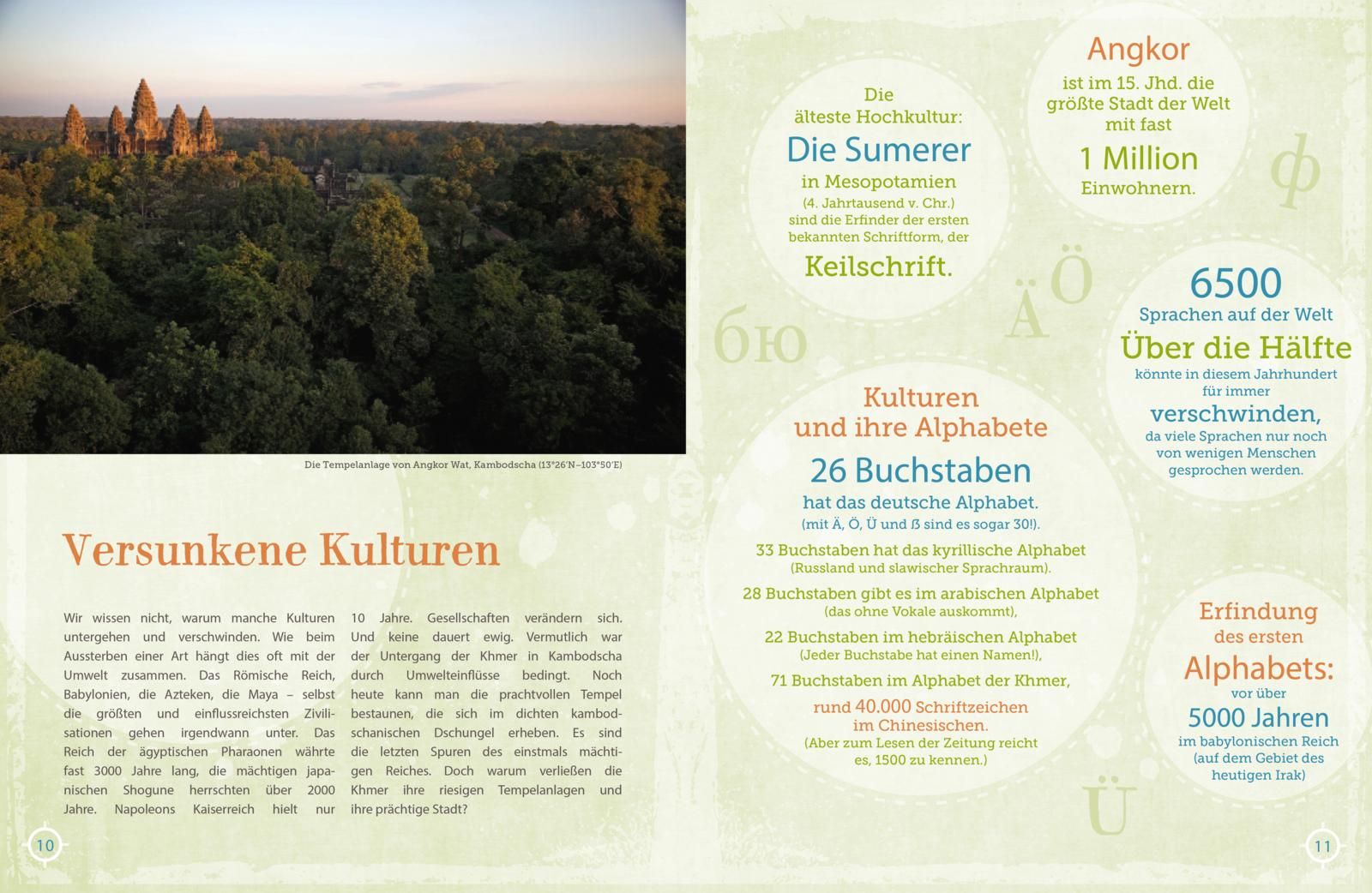 InhaltVersunkene Kulturen Vergessene Tempel Überreste einer blühenden Zivilisation Die Stadt von morgen Im Meer bauen Merkwürdige InselnDer Meeresspiegel steigt Das prächtige Venedig kämpft gegen die Fluten Rettet Venedig! Platz da! Auf in die Vororte Immer größerWenn die Nacht zum Tag wird Der Mensch sprach: Es werde Licht Die Welt bei Nacht Krieg um Öl Der erbitterte Kampf ums schwarze Gold Kriegsspuren Wald in Not Palmen in Reih und Glied Aus Wäldern werden Felder Wasser, ein kostbares Gut Begrünte Wüste Kreisrunde Felder Der menschliche Wahnsinn Bis zum letzten Tropfen Nur noch Pfützen Meer ohne Wasser Ein Leben ohne Regen Wüste in Bunt Das Eis schmilzt! Globales Fieberthermometer Das Ende des ewigen Schnees Aus dem Gleichgewicht Klimaanlage aus Eis Aus Eis wird Wasser Welt aus Eis Mehr als gedacht! Berge und Täler Die grüne Lunge Wettermacher Wald Wasser auf Reisen Eine fragile Festung Empfindliche Riesen Es war einmal ein Vulkan Inselparadiese Verantwortungsvoll reisen Wunder der Natur