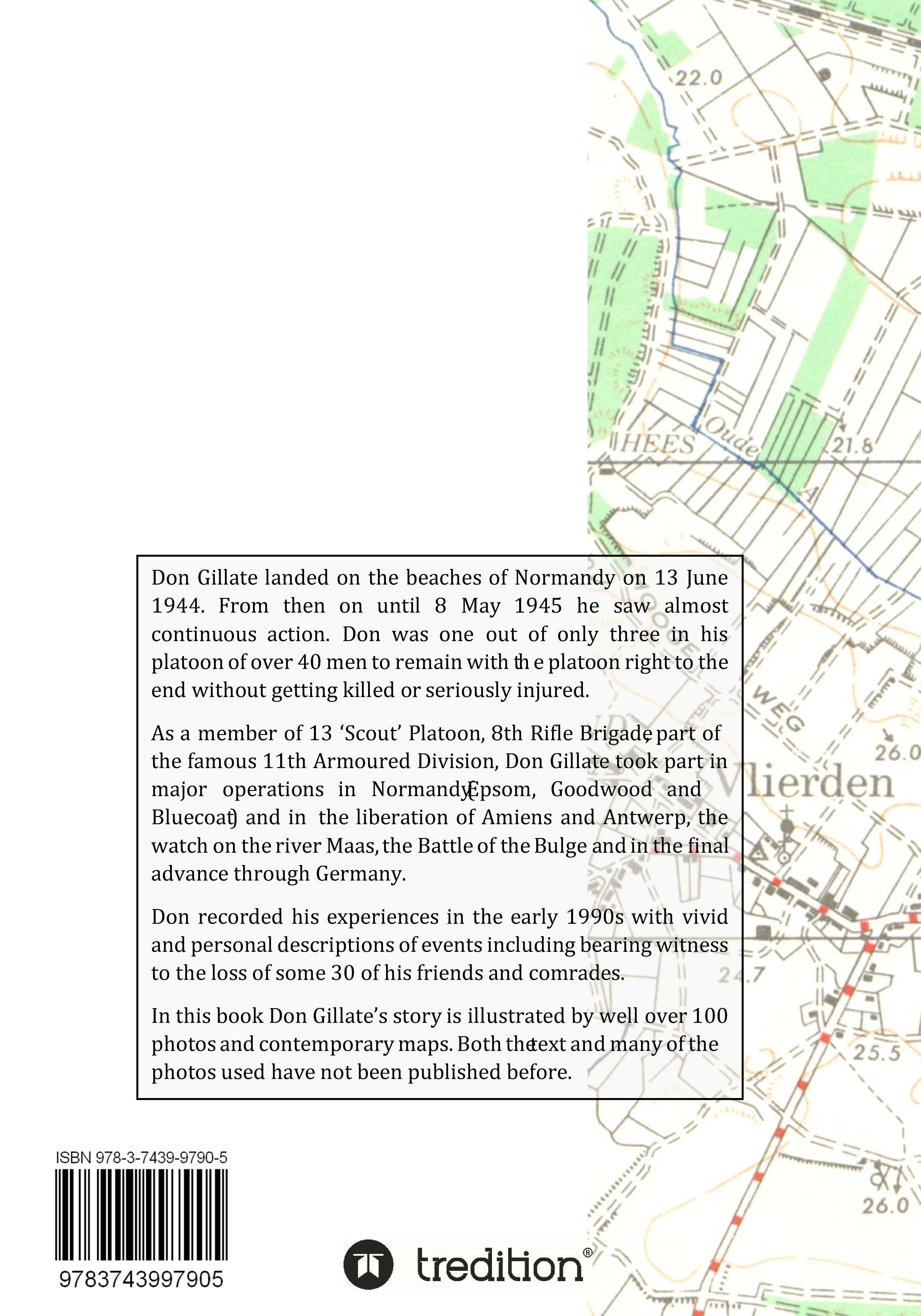 Don Gillate was born in 1922 and called up to join the British Army in 1941. From June 1944 until May 1945 he took part in the liberation of North-West Europe, serving as a front line soldier with the 8th Rifle Brigade, part of the famous 11th Armoured Division. Right after the war, while still in the army, Don had a brief career with the British Forces Network in Hamburg, first as announcer and eventually as head of programmes. After being demobbed he took up his studies to become an English teacher and later went on to study drama at the Rose Bruford Drama College in London. Most of his carreer he worked for the British Counsel, in many different countries. Don recorded his experiences in the early 1990s. Together with his wife Marjorie he had three sons. Don Gillate died in 2009.
