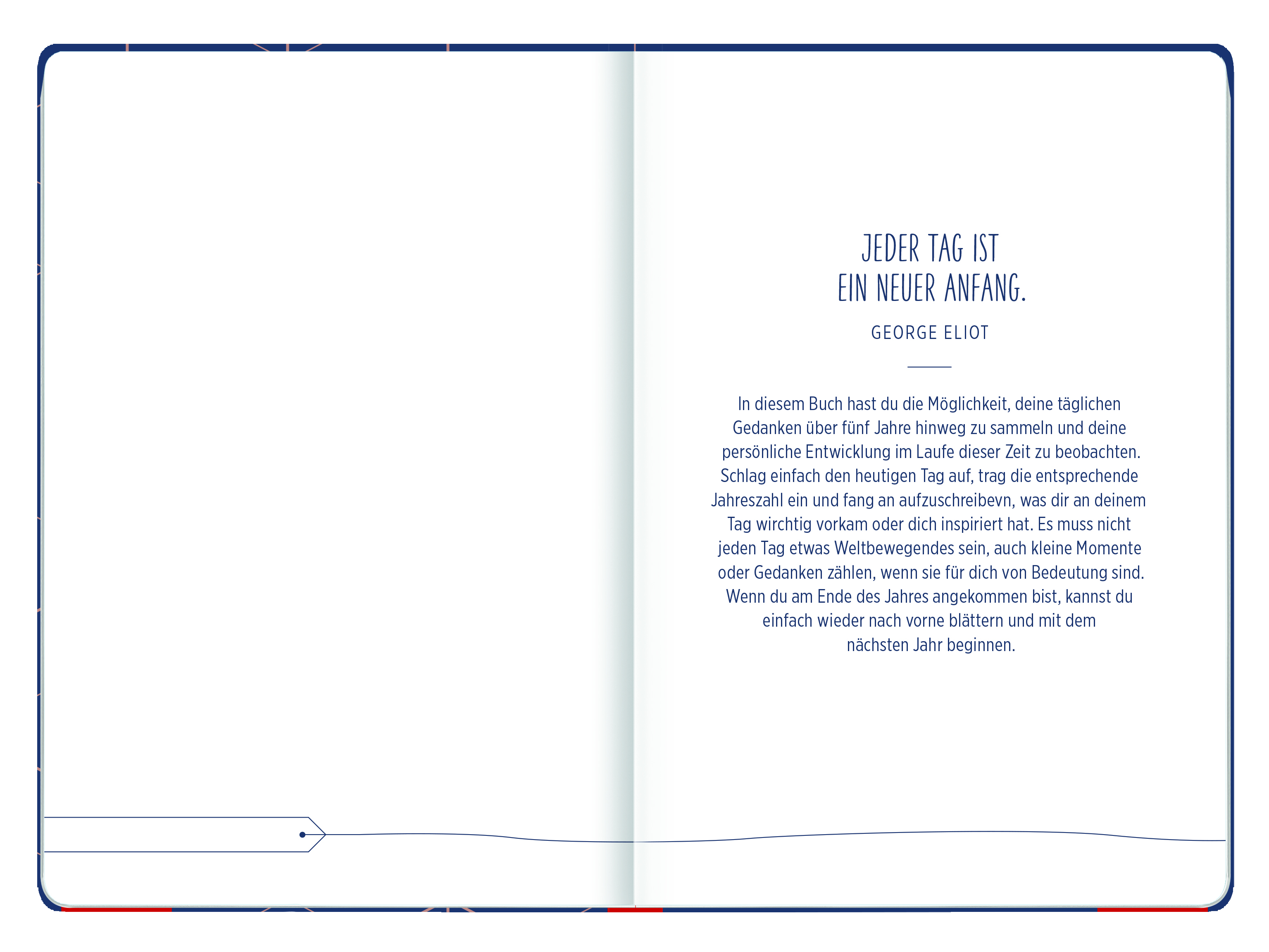 Aphorismen und Zitate lockern das Tagebuch auf und inspirieren dich, jeden Tag bewusst zu erleben. So wird das Eintragbuch zu einem treuen Begleiter für fünf Jahre und zu einer wertvollen Sammlung deiner Gedanken und Erinnerungen.