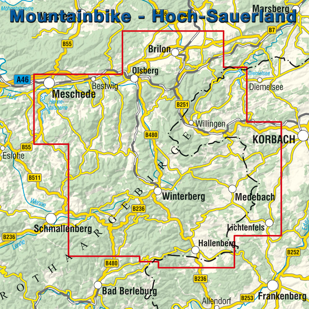 Die neue Ausgabe der Mountainbikekarte "Hoch-Sauerland" stellt im übersichtlichen Maßstab 1:35 000 die Region Brilon - Medebach - Willingen - Winterberg bis Hallenberg mit den Mountainbiketouren der "Bike Arena Sauerland" vor. 25 Mountainbiketouren werden mit einem Höhenprofil und einer Kurzbeschreibung vorgestellt. Die zusätzliche Darstellung einiger Wanderwege erleichtert die individuelle Verknüpfung der Touren. Eine Detailkarte des Trailparkes Winterberg rundet das Angebot ab.