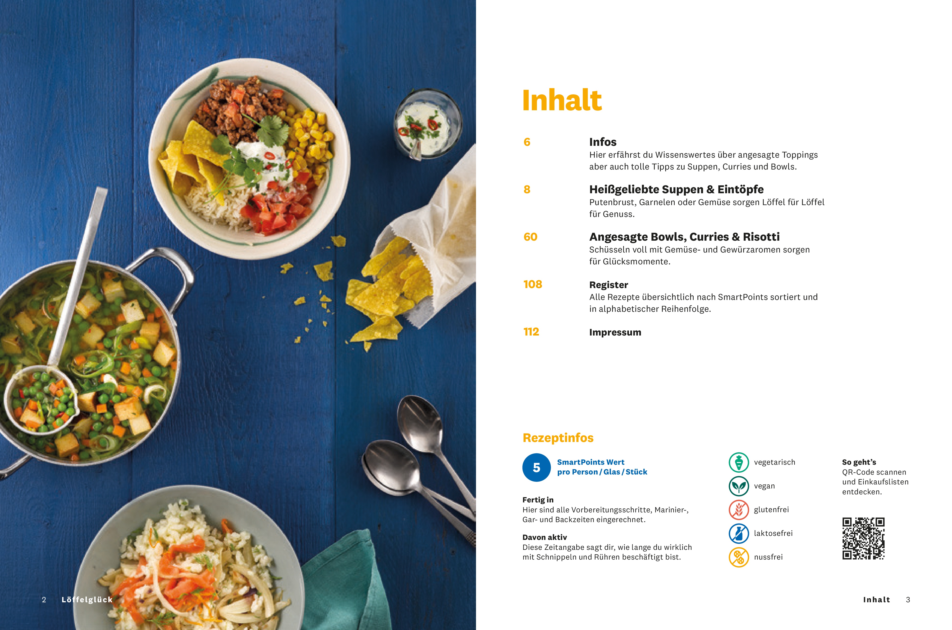 Ganz egal, ob Sie abnehmen möchten oder sich einfach gesund und ausgewogen ernähren wollen, das WW Kochbuch "Löffelglück" bietet leckere und schnelle Rezepte für jeden Geschmack: gehaltvoll wie der Tortellini-Bohnen-Eintopf oder die deftige Krautsuppe mit Kasseler, oder würzig-exotisch wie die Thai-Glasnudelsuppe mit Garnelen oder das indische Fisch-Kartoffel-Curry. Bunte Bowls bringen in der kalten Jahreszeit Farbe auf den Tisch: die Chili-Mais-Bowl oder die warme Quinoa-Bowl mit Spiegelei haben das Potential, Ihr neues Lieblingsessen zu werden! Mit dabei ist auch ein Grundrezept für einen Gemüsefond und eine grüne Thai-Currypaste.
