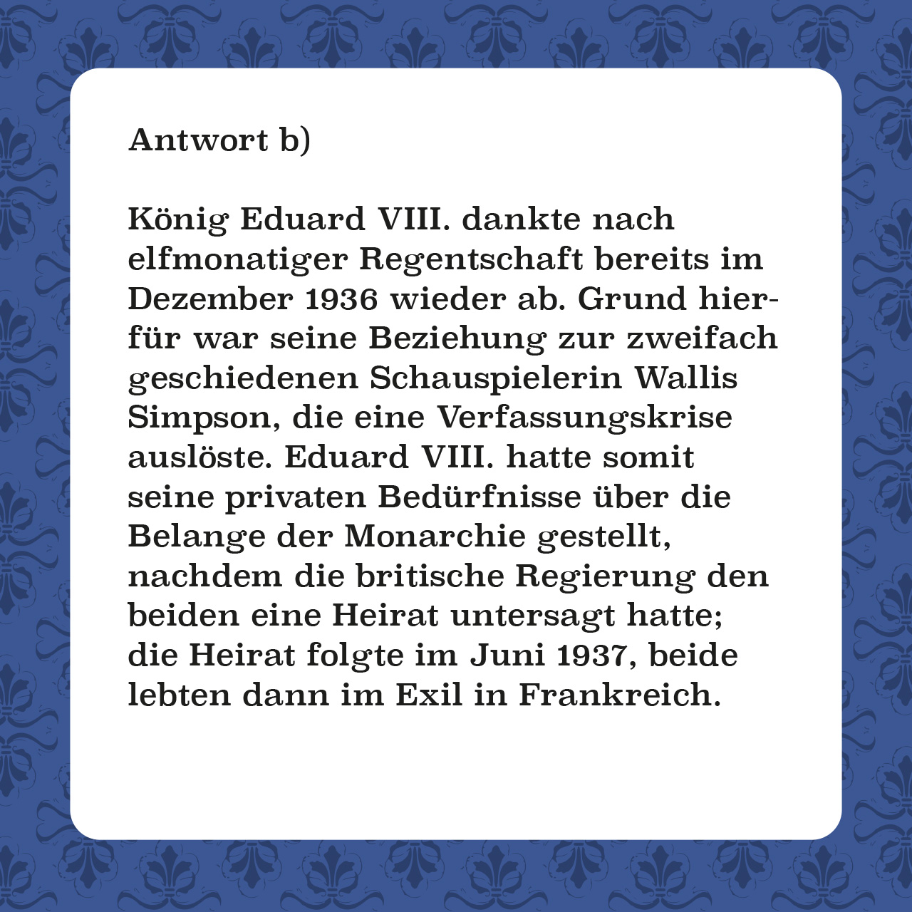 Wie Sie sehen, hat nicht nur die britische Monarchie Spannendes zu bieten. Doch auch dieser sind natürlich einige der 66 Quizfragen gewidmet. Unter anderem geht es um den Kate-Middleton-Effekt, tierische Untertanen und den deutschen Namen, den das britische Königshaus bis 1917 trug.