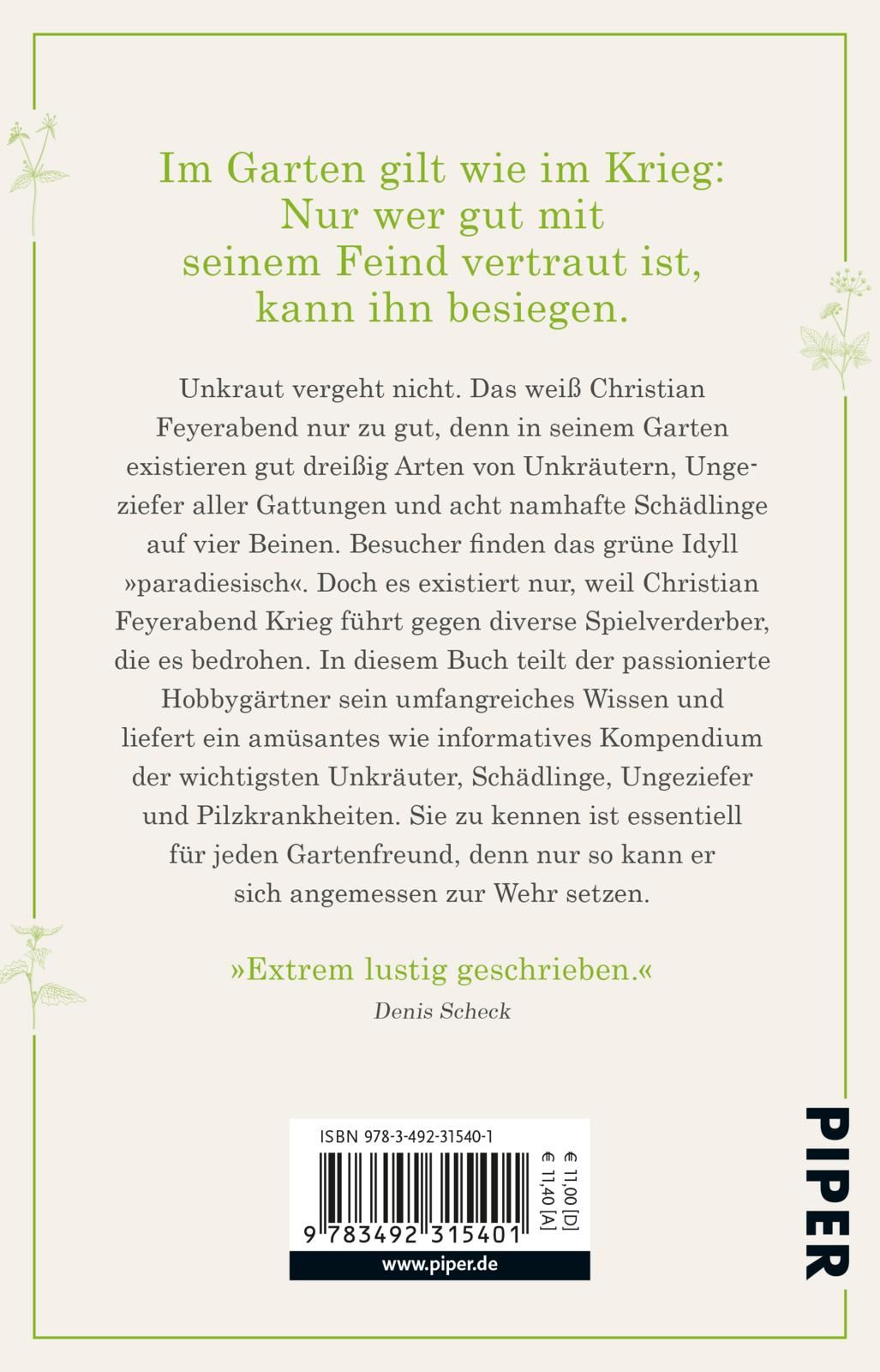 Unkraut vergeht nicht. Das weiß Christian Feyerabend nur zu gut, denn in seinem Garten existieren gut dreißig Arten von Unkräutern, Ungeziefer aller Gattungen und acht namhafte Schädlinge auf vier Beinen. Besucher finden das grüne Idyll »paradiesisch«. Doch es existiert nur, weil Christian Feyerabend Krieg führt gegen diverse Spielverderber, die es bedrohen. In diesem Buch teilt der passionierte Hobbygärtner sein umfangreiches Wissen und liefert ein amüsantes wie informatives Kompendium der wichtigsten Unkräuter, Schädlinge, Ungeziefer und Pilzkrankheiten. Sie zu kennen ist essentiell für jeden Gartenfreund, denn nur so kann er sich angemessen zur Wehr setzen.