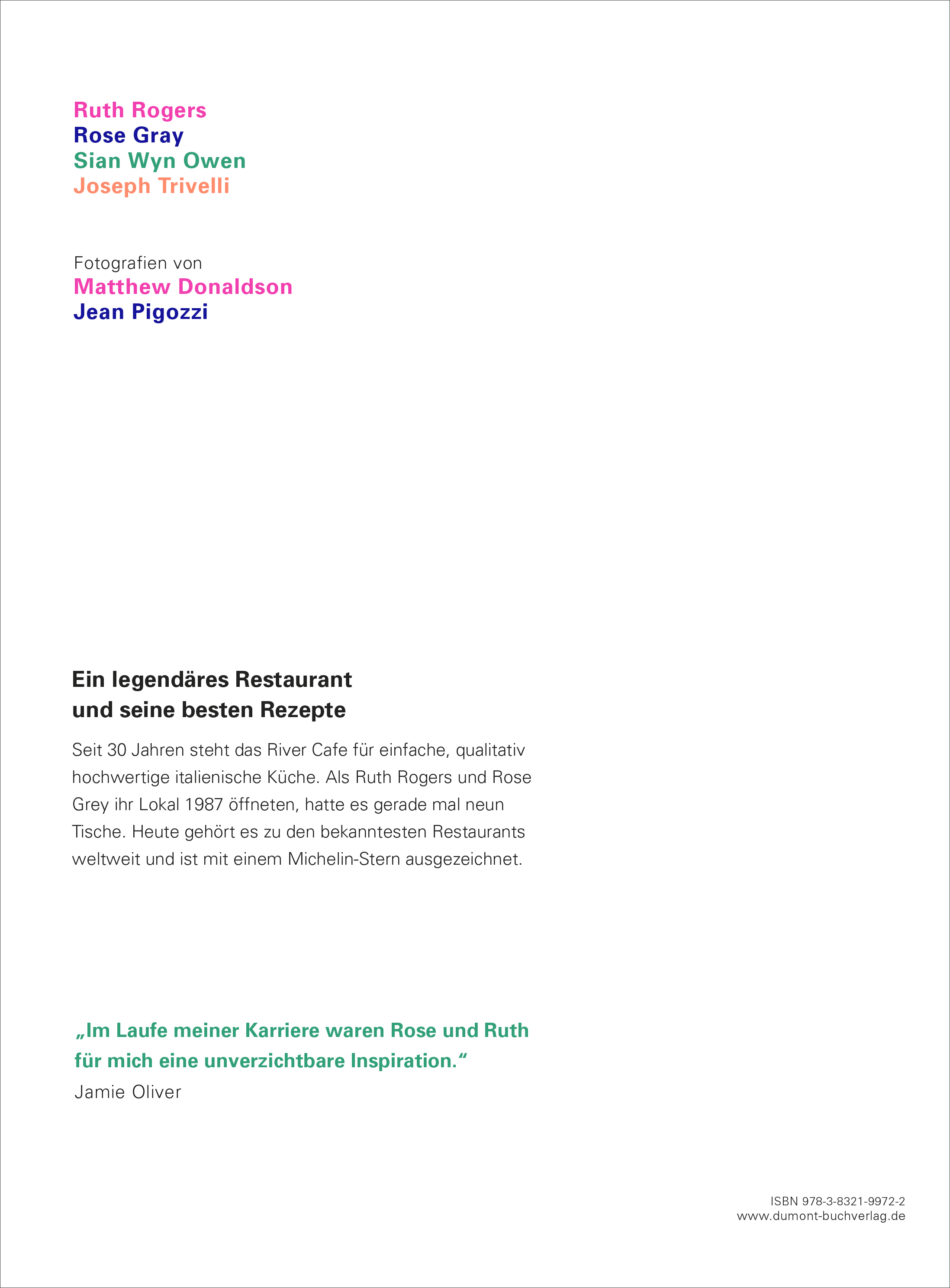 Zusammen mit der klaren Foodfotografie, den sorgfältigen Kochtipps und dem farbenfrohen Erscheinungsbild ist das Jubiläumskochbuch die Essenz des Restaurants und seiner Esskultur. Ruth Rogers und ihre Chefköche Joseph Trivelli und Sian Wyn Owen laden dazu ein, 30 Jahre Erinnerungen und gutes Essen im Londoner The River Cafe zu erleben.