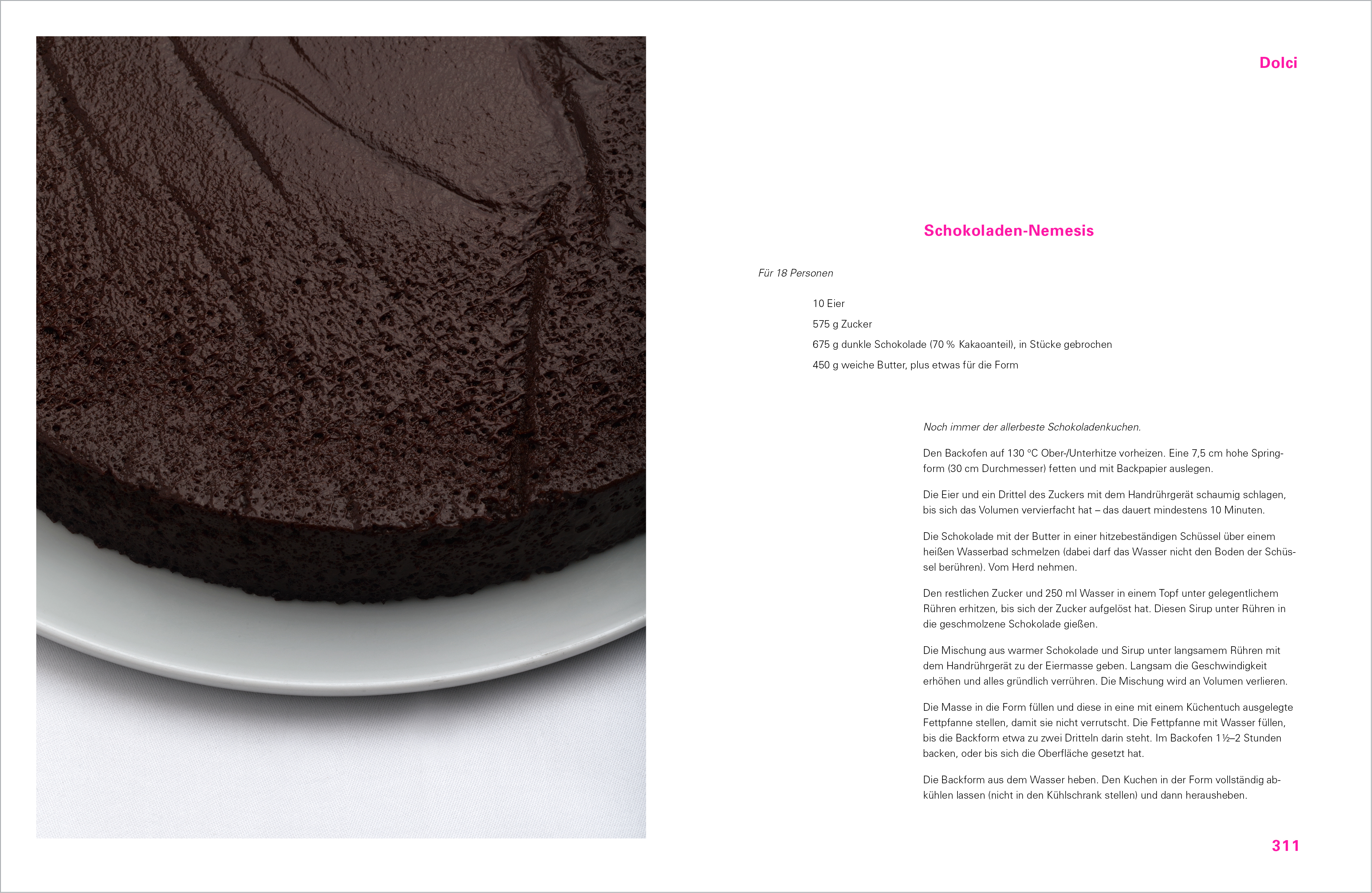 In diesem Jubiläumsband sind über 120 Rezepte für unvergleichliche Antipasti, Primi, Secondi, Beilagen und Nachspeisen versammelt – sowohl bewährte Klassiker als auch aktuelle Favoriten. Der Fokus wird auf erstklassige Zutaten gelegt, in ihrer Zubereitung sind die Gerichte vergleichsweise simpel und für jedermann nachvollziehbar. Die Garantie für echten italienischen Genuss sind so einfache Gerichte wie Zitronenspaghetti, schwarzes Risotto mit Mangold und auch der berühmte Schokoladenkuchen Chocolate Nemesis.