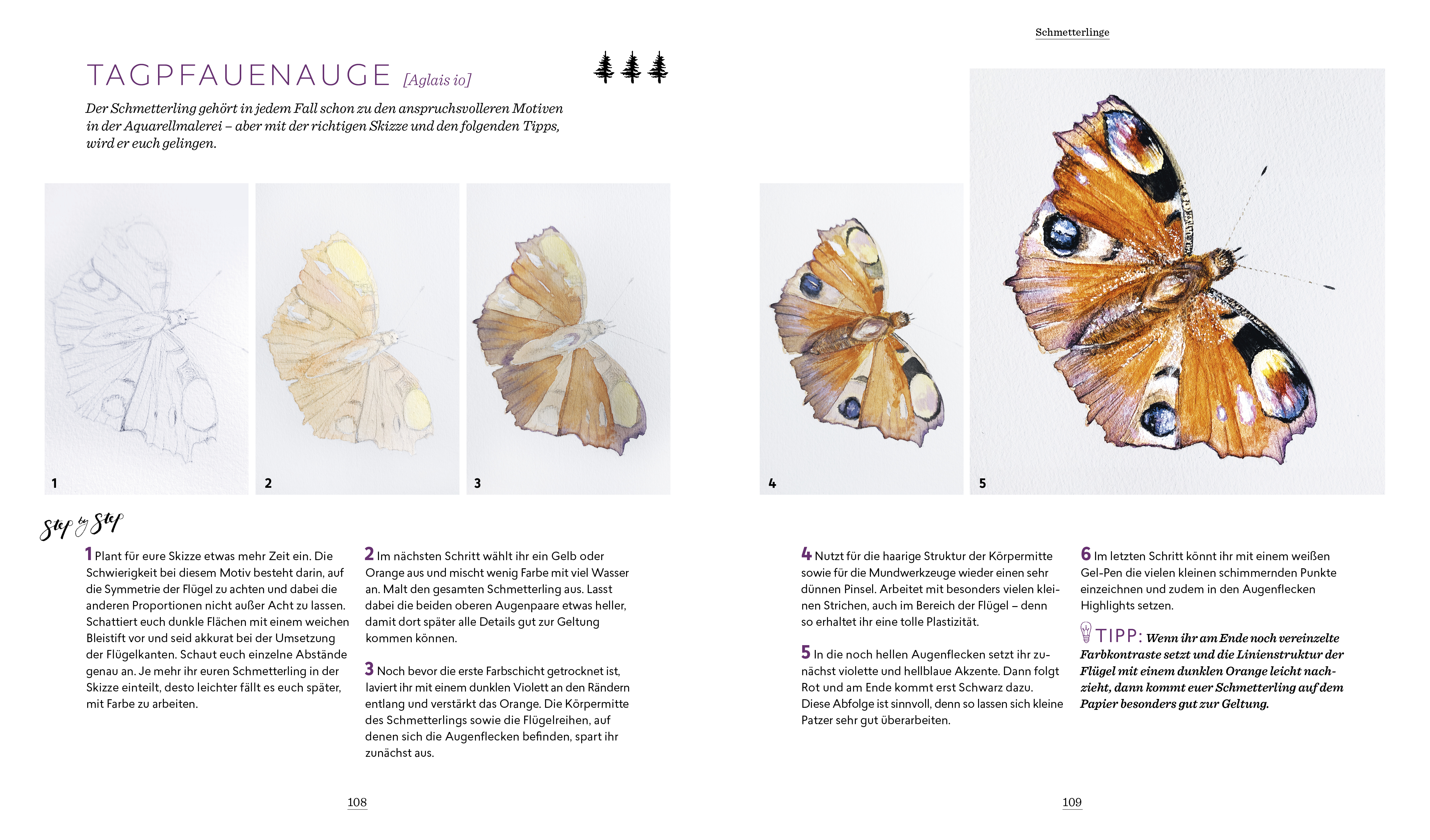 "[Elisa Peth] lädt uns zu einer kreativen Auszeit ein und verzaubert uns mit wunderbaren Motiven wie Vögeln, Blättern, Bäumen und Zapfen, die selbst Anfängern in Aquarelltechnik gelingen."
