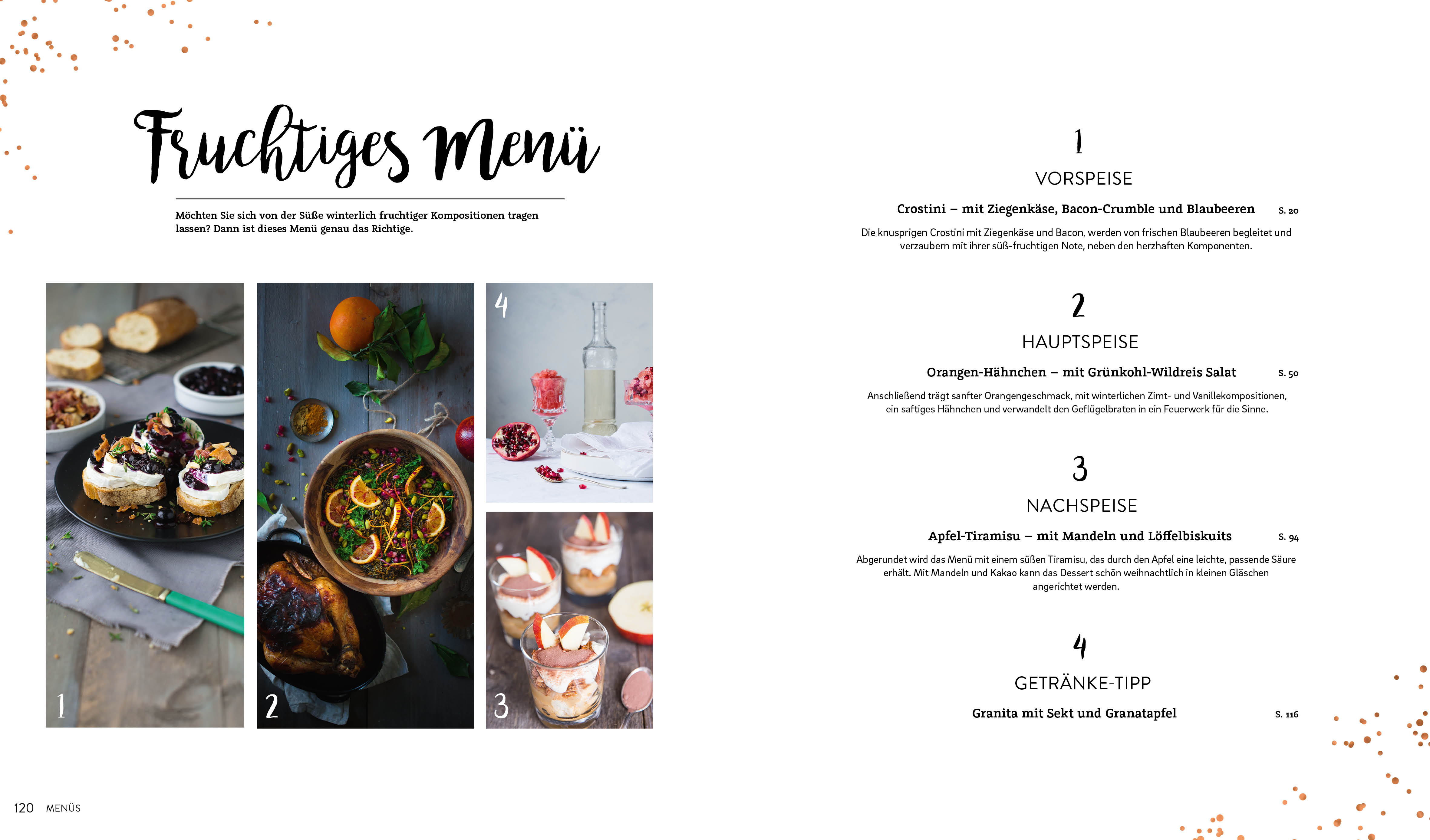 Aromenfest zur WeihnachtszeitWas gibt es eigentlich Weihnachten? Diese Frage ist ab jetzt schnell zu beantworten. Mit den über 50 Rezepten ist das Weihnachtsessen Festtagsküche vom Feinsten: edle Vorspeisen und Hauptgerichte, (be)sinnliche Desserts und prickelnde Getränke lassen sich zu beeindruckenden Menüs zusammenstellen. Von Vorspeisen wie Crostini mit Ziegenkäse und Bacon-Crumble, Pastinakensuppe mit Florentiner-Plätzchen über Hauptgerichte wie Rote Tortellini mit Ziegenkäsefüllung, Rindersteaks mit Gremolata bis zu Desserts wie Rotweinbirnen mit Kardamom-Mascarpone oder Spekulatius-Eis. Abgerundet werden die Menüs mit ausgefallenenen Getränkeempfehlungen wie Brombeerlimo oder ein Rosendrink mit Crème de Cassis. Mit den praktischen Menüvorschlägen von fruchtig und leicht bis elegant oder vegan ist die Planung für das Weihnachtsessen eine genussvolle Freude!